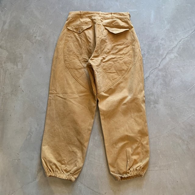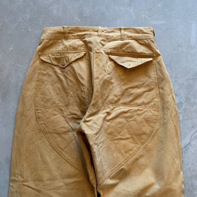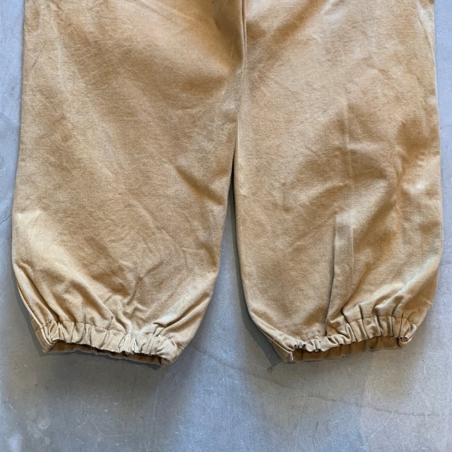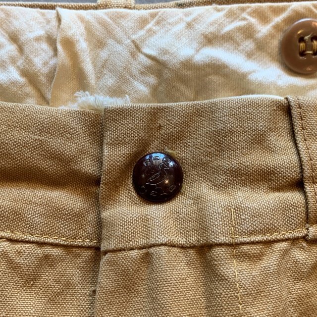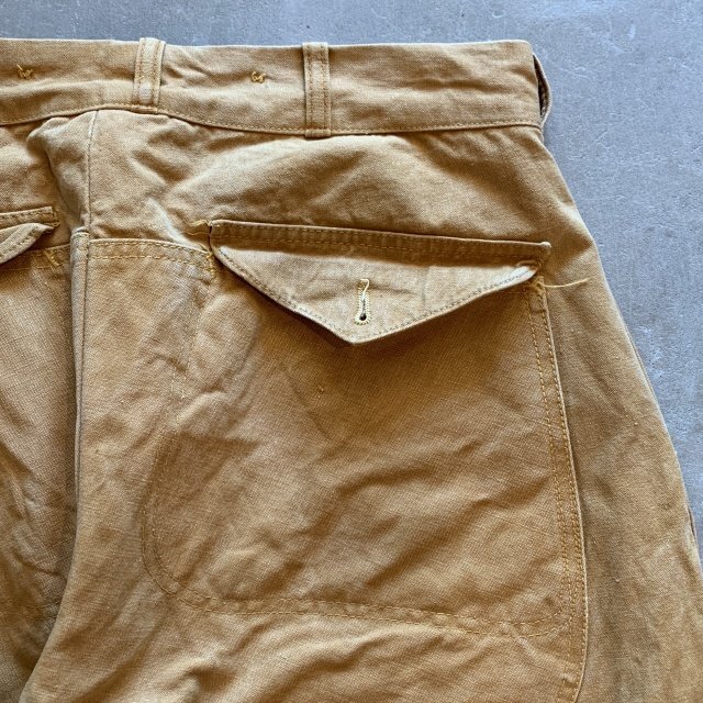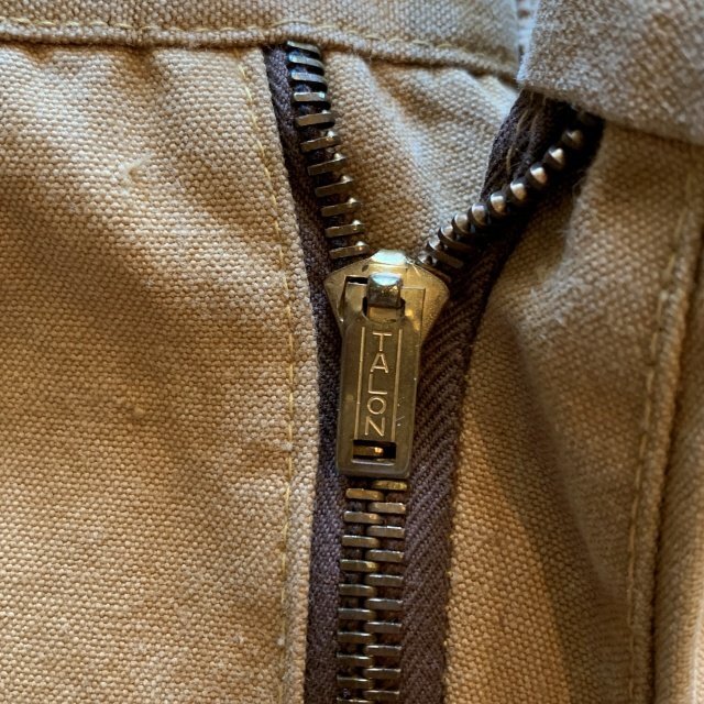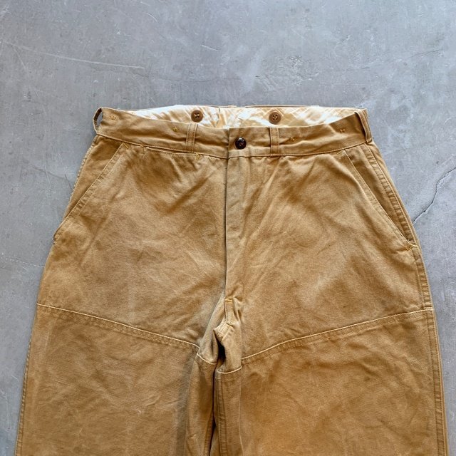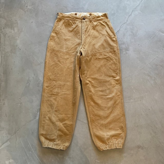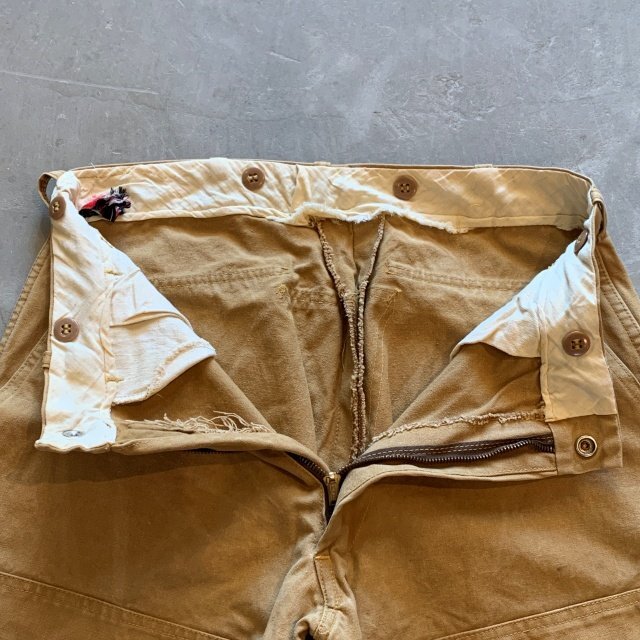 ★商品状態★ ・着用感があり、右膝に4㎝程度の縦線状の生地裂けダメージが見られますがダブルニー仕様のため問題ありません。裾には後入れと思われるゴムが入っており、右バックポケットボタンの欠損、一部薄汚れなどが見られます。 ・古着慣れされている方でしたら問題なく着用していただける程度かと思います。 ・TALONジップ ★素材★ コットン ダック地 ★配色★ 茶系 ★サイズ表記★ W30インチ相当 ・実寸を参考にして下さい。 ★実寸サイズ★ ウエスト 38㎝ 股下 70㎝ 股上 31㎝ 腿幅 32㎝ 裾幅 17㎝ ・平置きにての採寸となります。 ・若干の誤差はご了承ください。 |