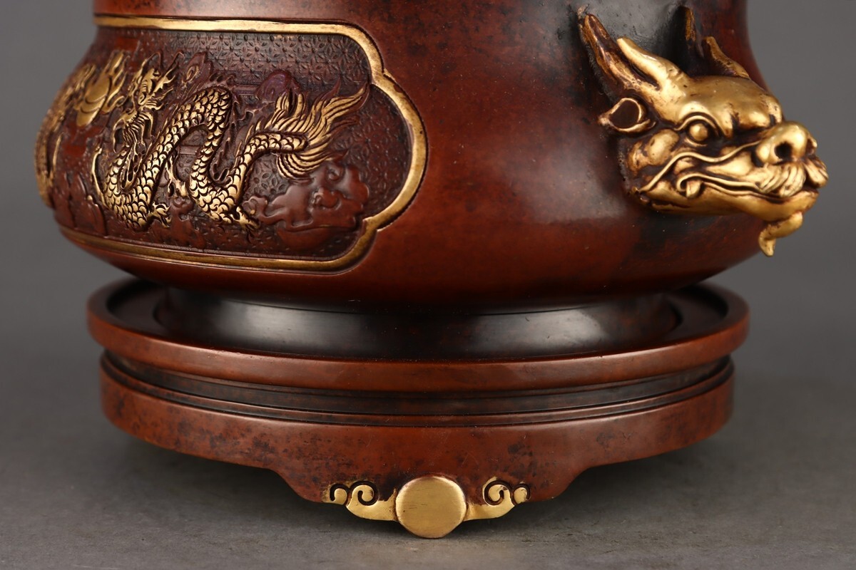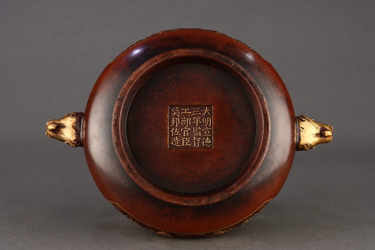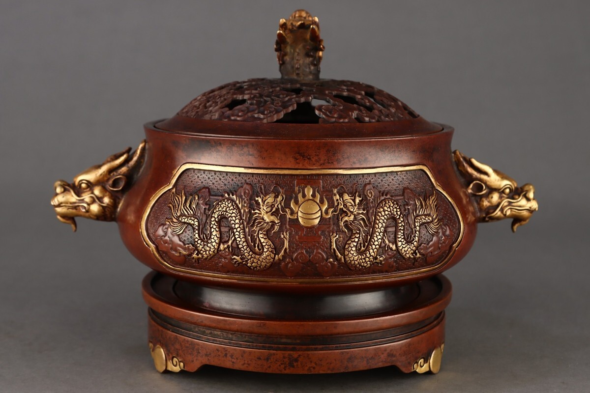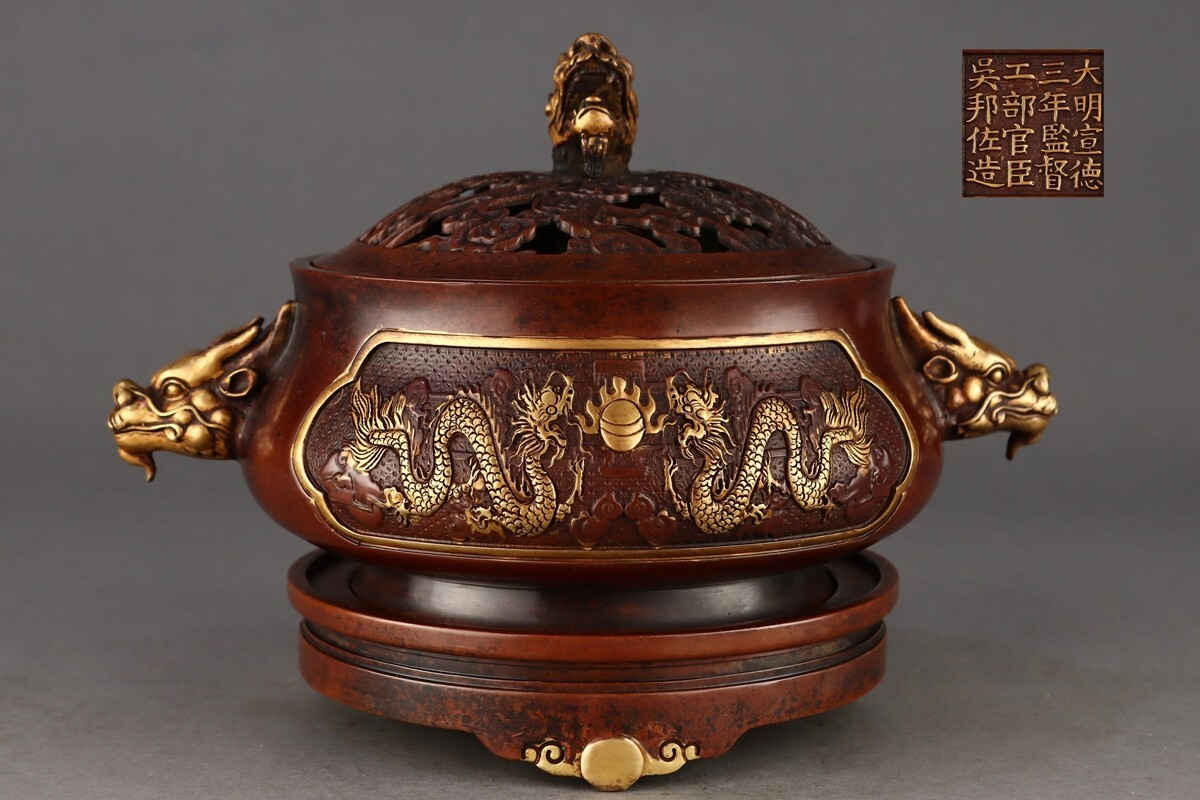 大明宣徳三年監督工部官臣呉邦佐造 古銅彫 塗金双龍戲珠紋 龍首耳香熏炉【仁】古銅器 置物擺件 古賞物 古美術 蔵出