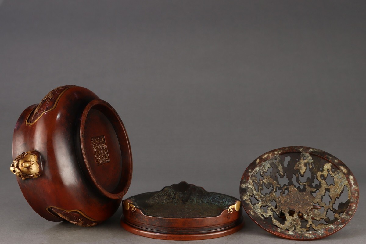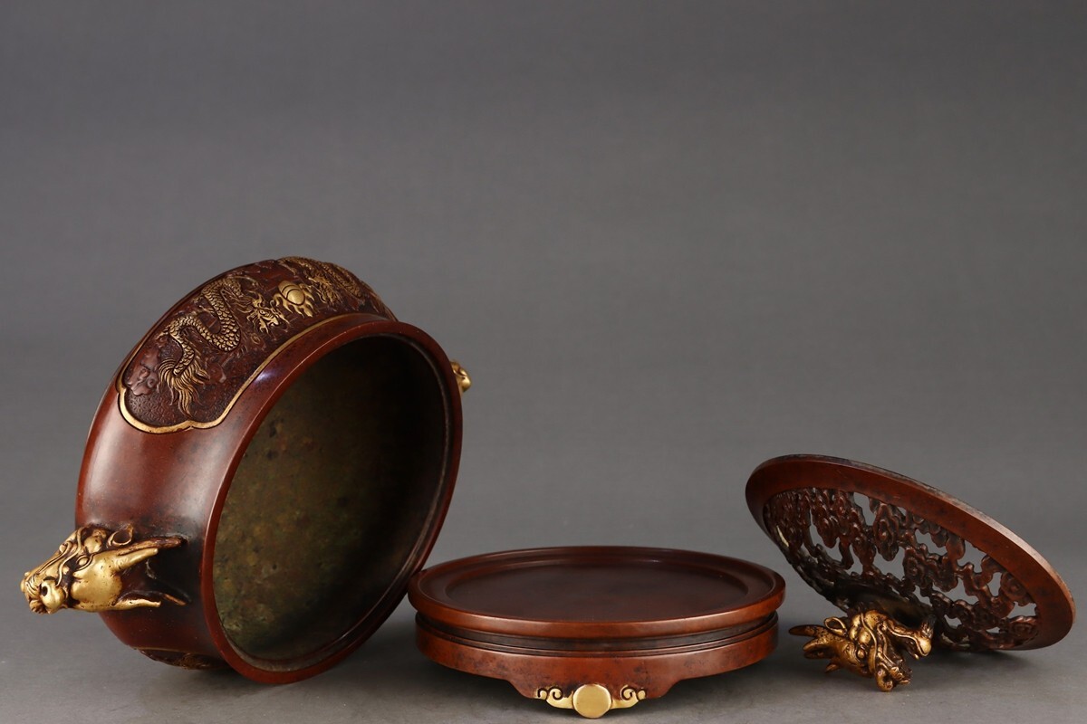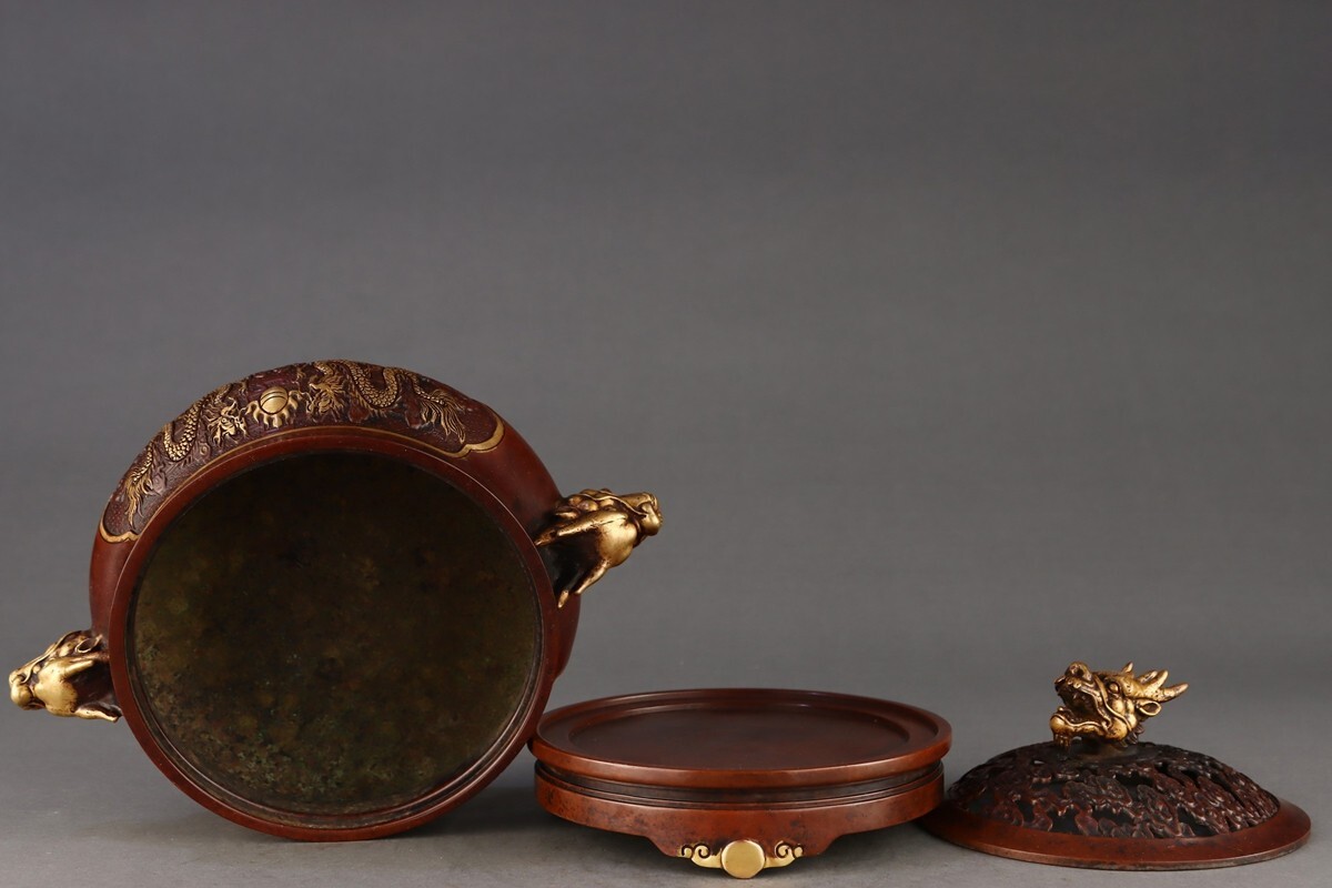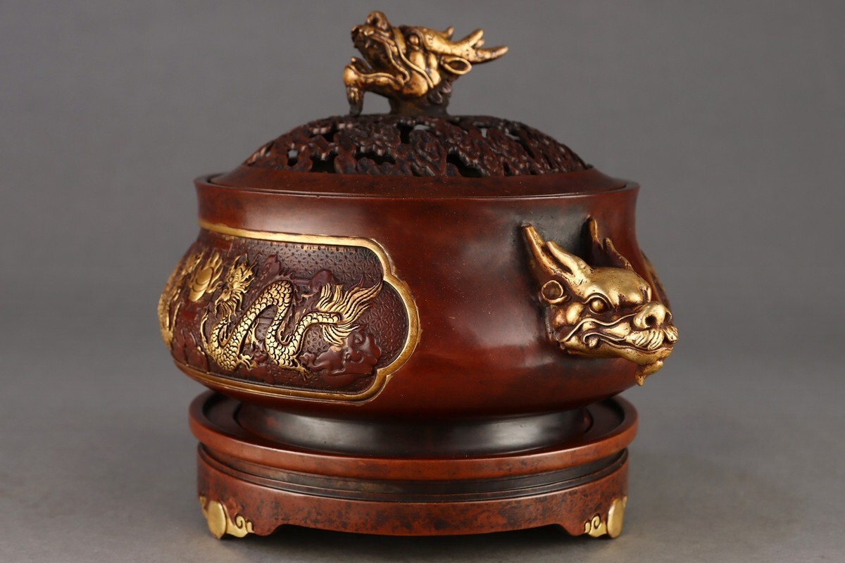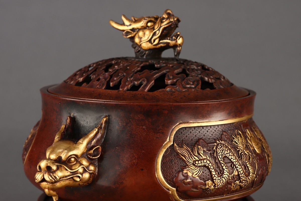 大明宣徳三年監督工部官臣呉邦佐造 古銅彫 塗金双龍戲珠紋 龍首耳香熏炉【仁】古銅器 置物擺件 古賞物 古美術 蔵出