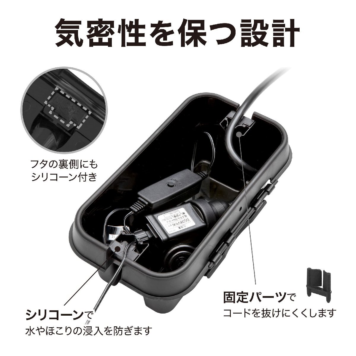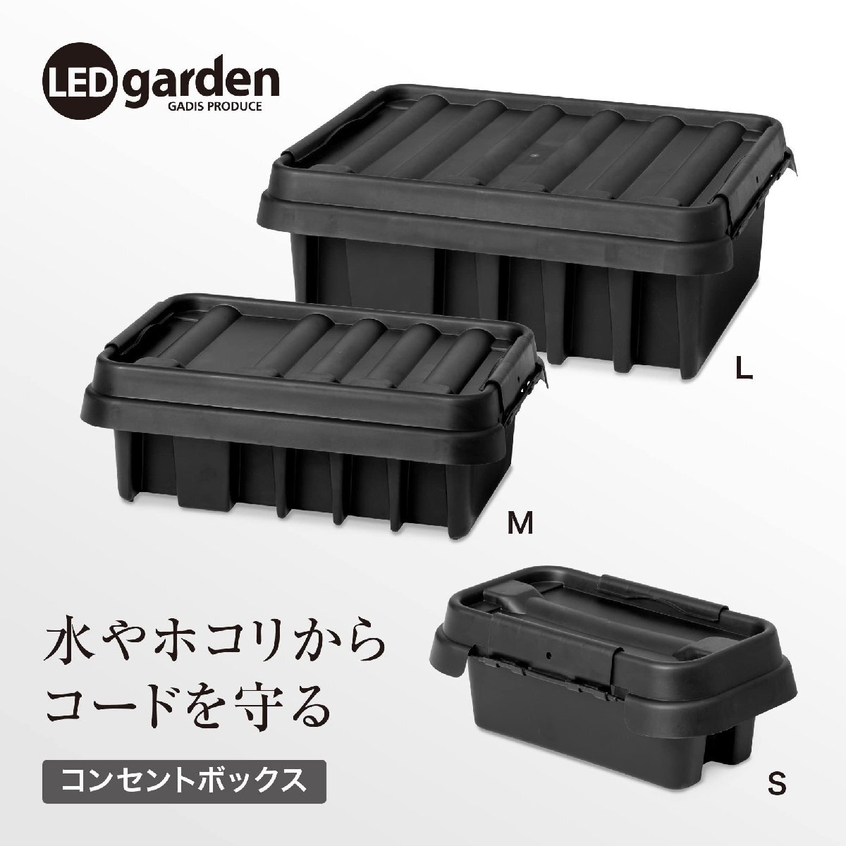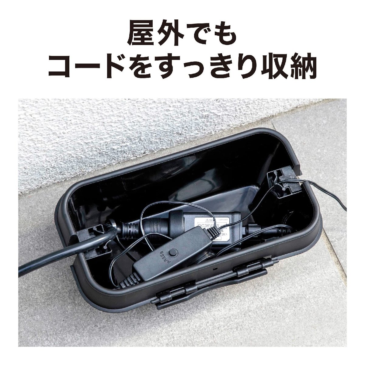 ブランド:タカショー(Takasho)カラー:ブラックサイズ:Sコードをすっきり収納、3つのサイズが揃いました。高い気密性で、雨水からコードを守り、感電、ショートなどによる事故を防ぎます。水やほこりの浸入防止。水やほこりの浸入防止。いたずら防止の結束バンド付。水やホコリからコードを守るコンセントボックス。イルミネーションや屋外用ライトのコード収納に。
