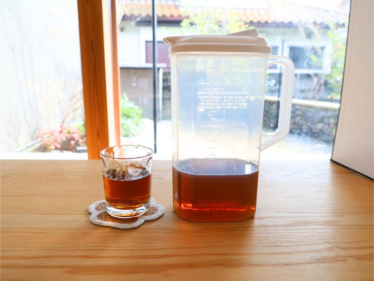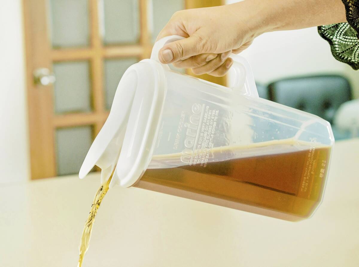ワンプッシュ開閉式の冷水筒 たっぷり入る容量2L 持つ時などに火傷の恐れがあるため、熱湯は冷ましてから入れてください。