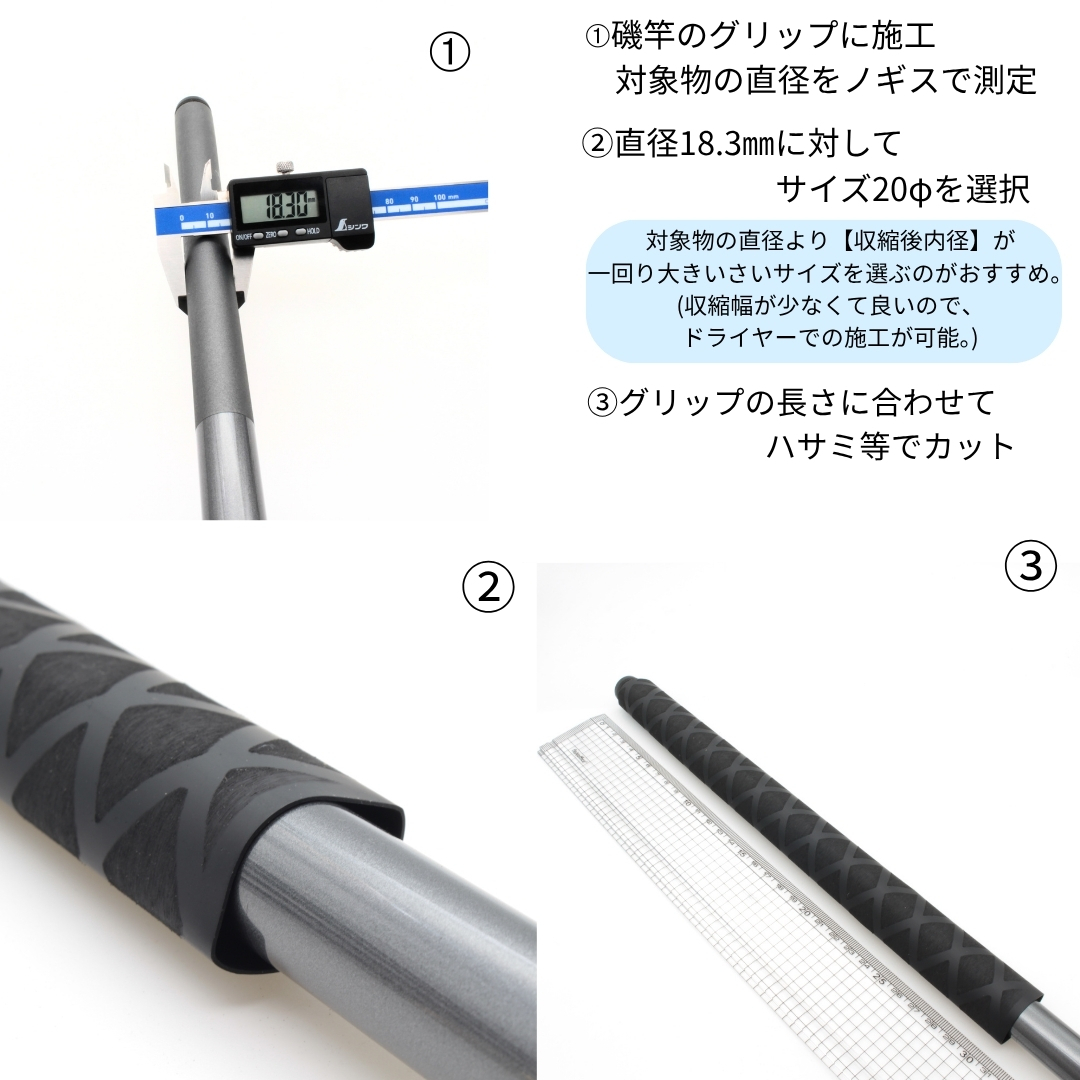 施工例の画像はΦ18.3㎜のグリップにΦ20㎜のチューブをドライヤー(1200W)で取り付けたものです。