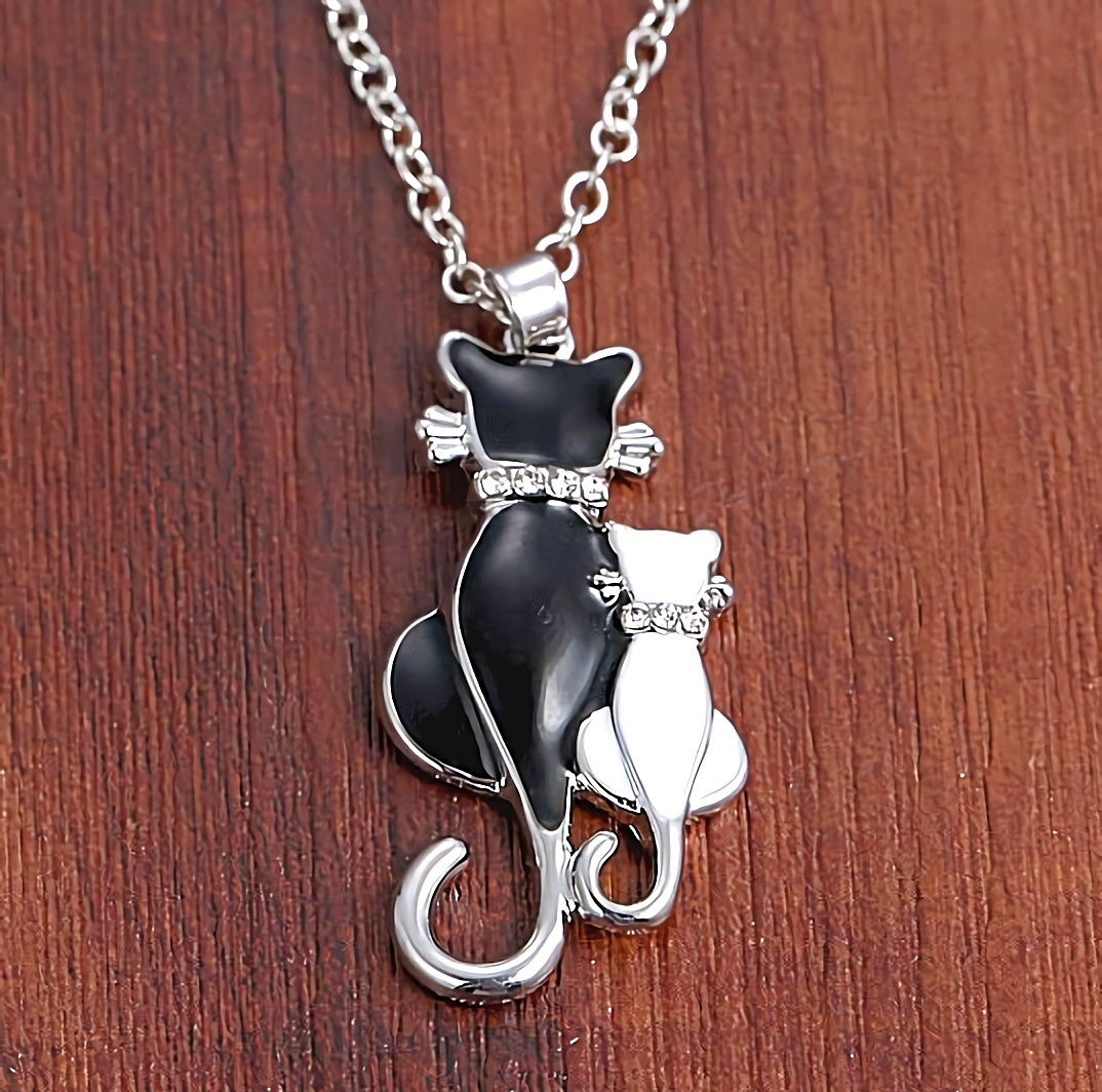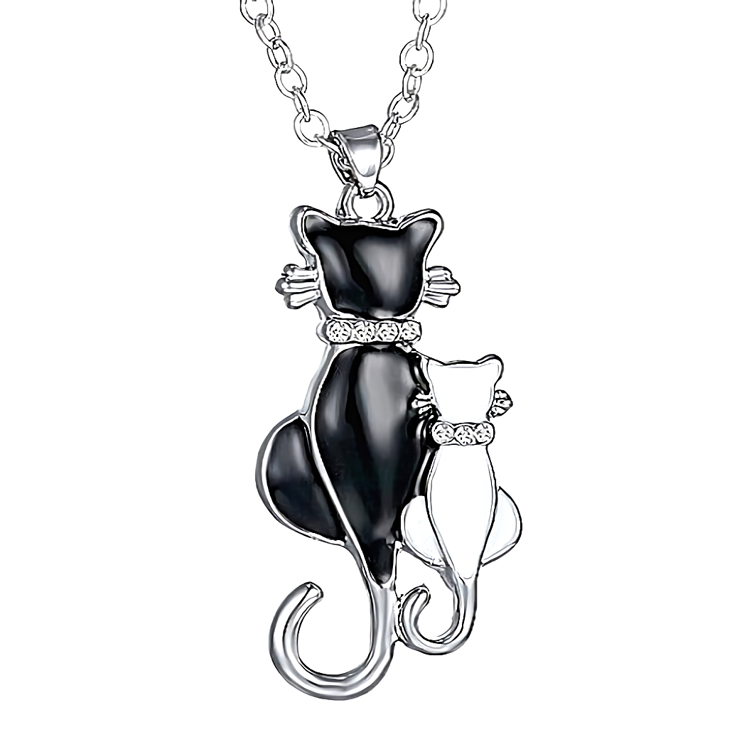 こちら仲睦まじく寄添う可愛い白黒猫のカップル、ダイヤモンドプラチナ仕上げ925シルバーネックレスです。