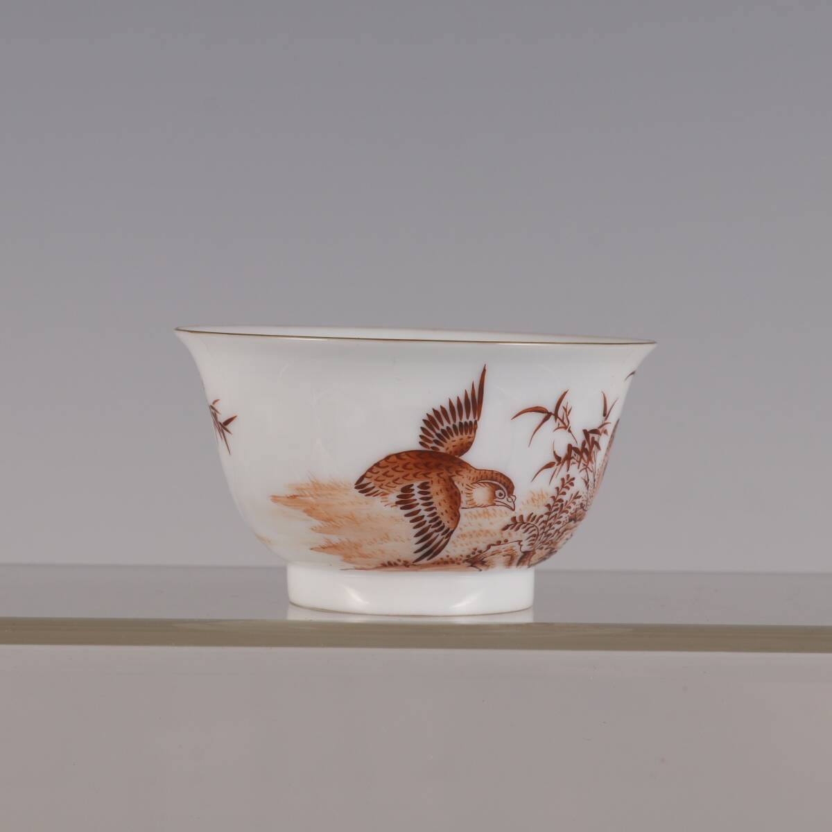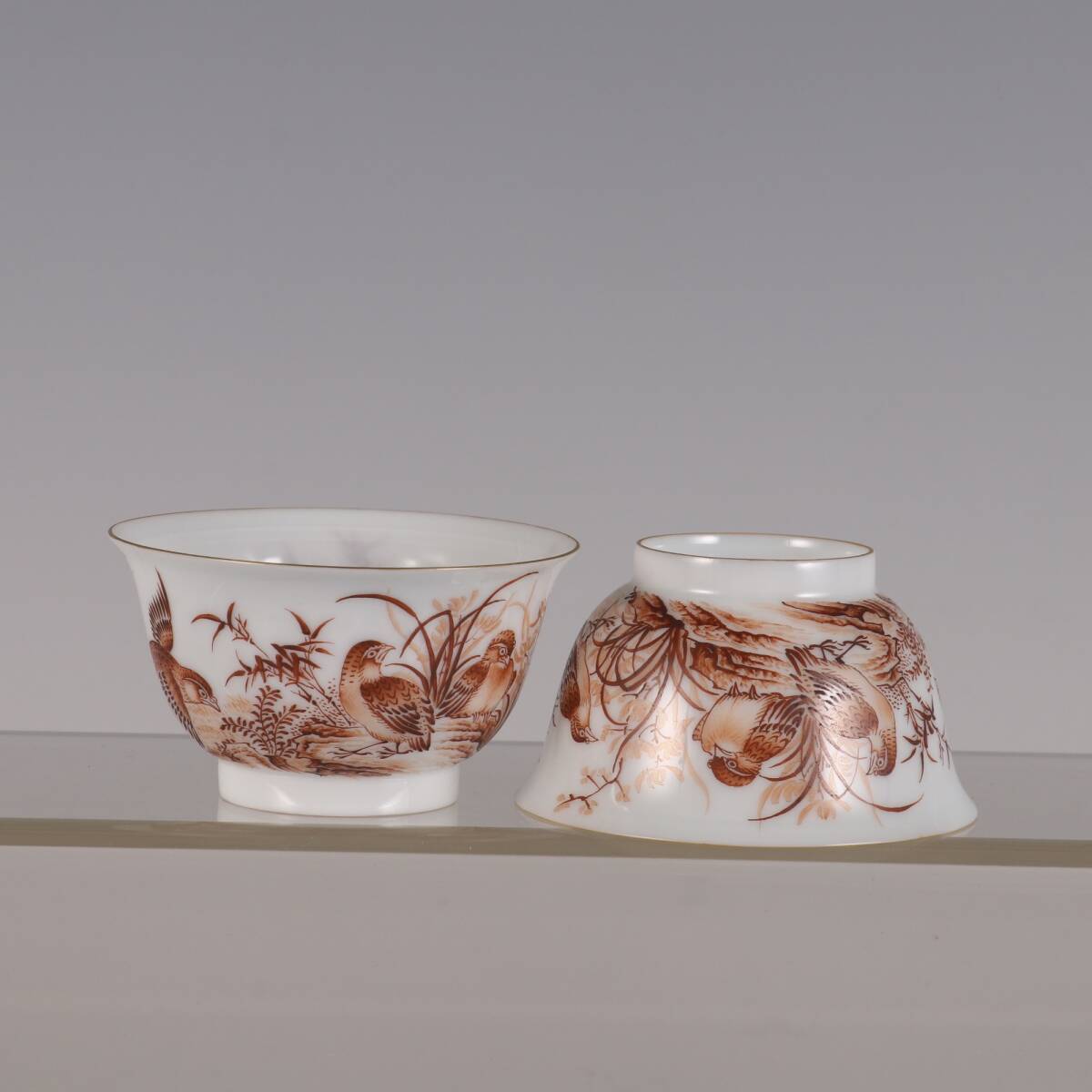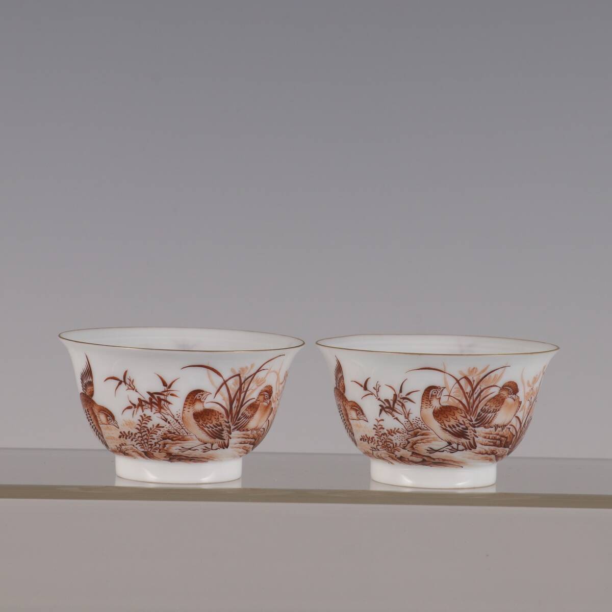 品名:礬紅彩鶉内暗刻纏枝蓮杯一対