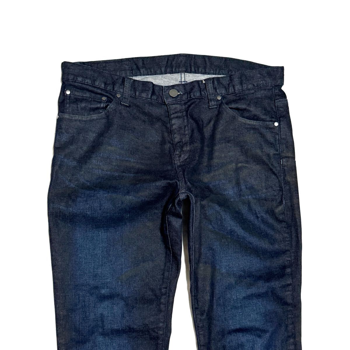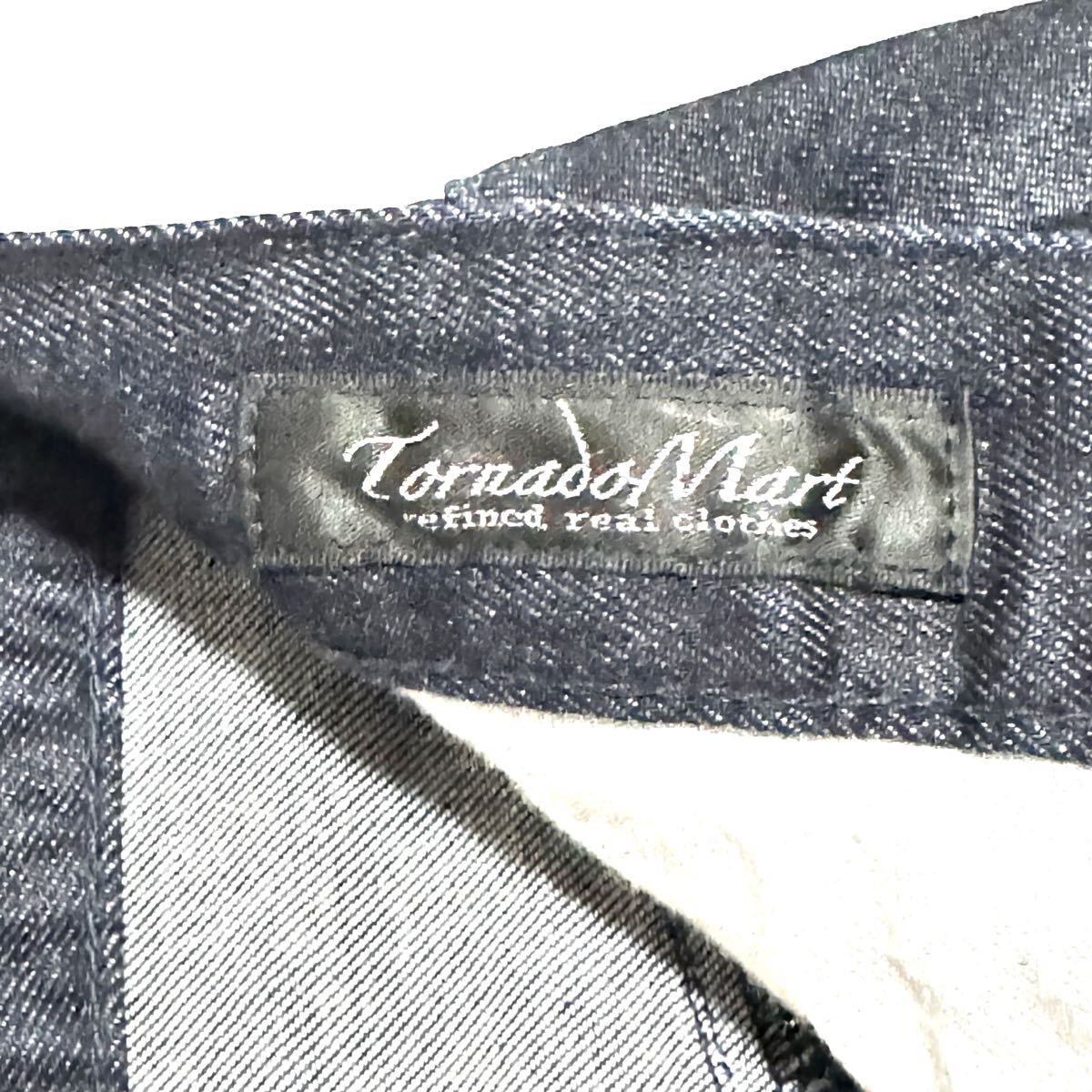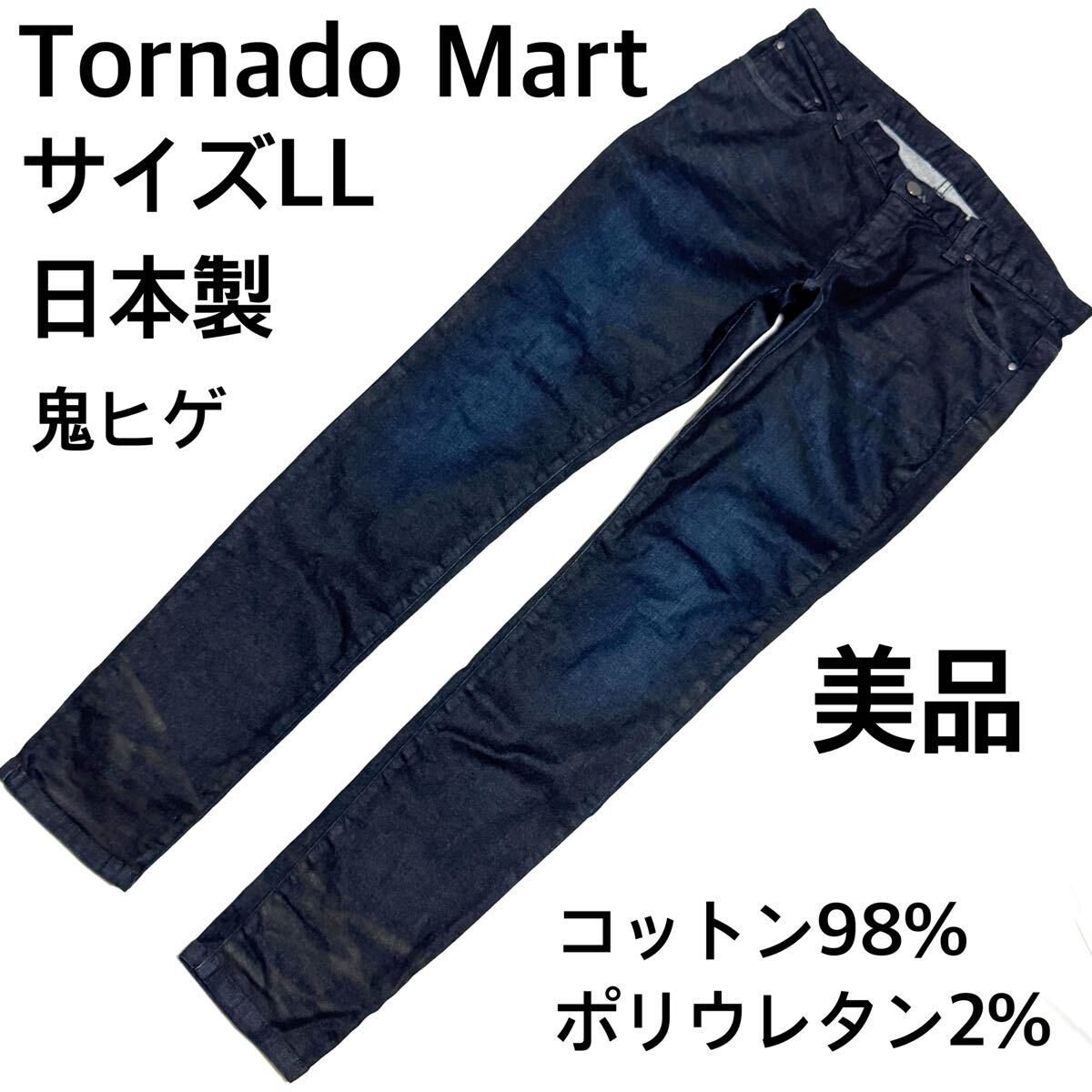 Tornado Martの日本製ジーンズです。存在感抜群の鬼ヒゲ加工が魅力。生地はコットン98%・ポリウレタン2%で、弱ストレッチ入り。シルエットはスリムでスタイリッシュ、タイトめに穿きこなしたい方におすすめです。ウエストはゴム仕様で44〜47cmまで対応。美品でコンディション良好。完売必至の人気モデル!