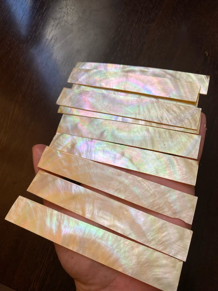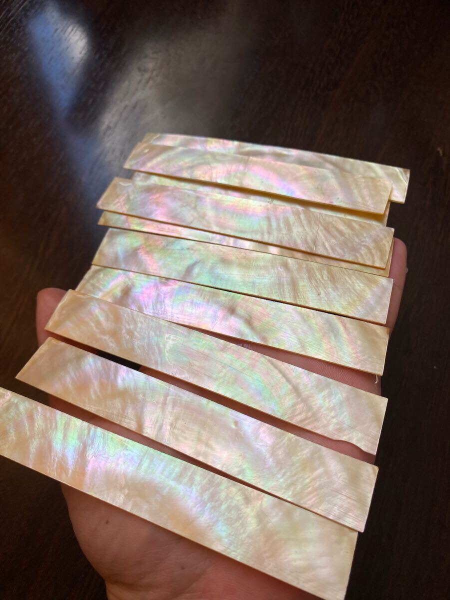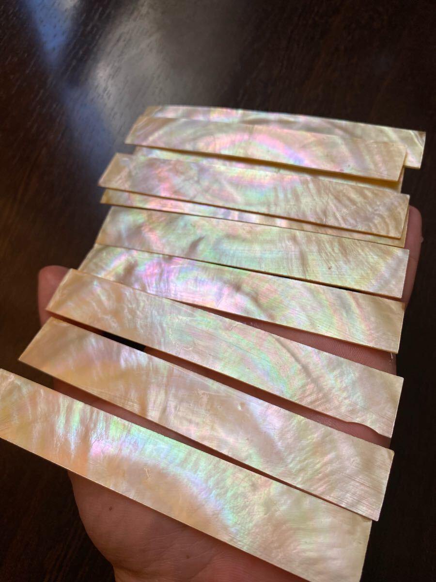 * 活かし貝殻を小さなパーツに切り分け、磨いて平らに仕上げてます