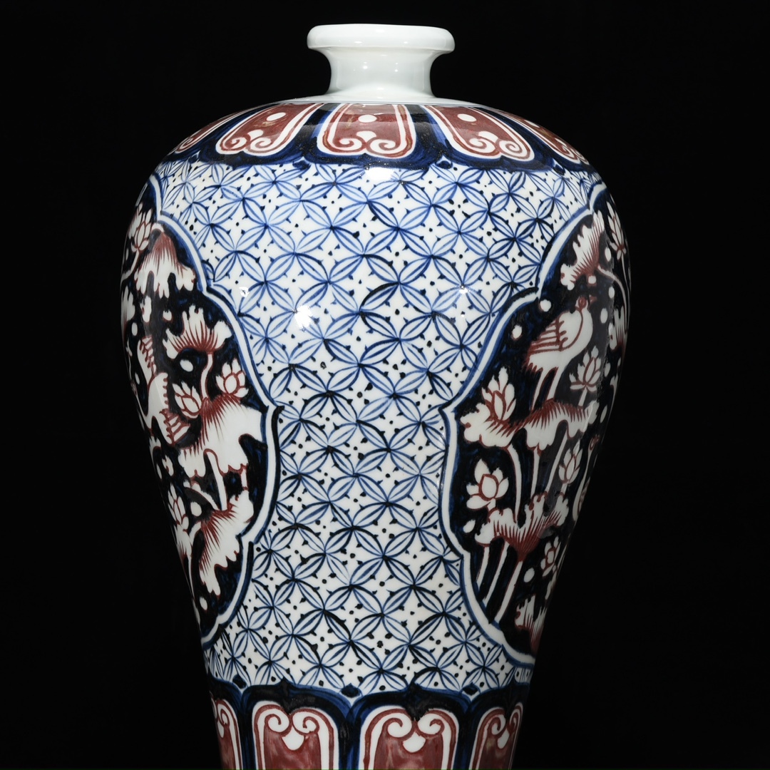 旧蔵 明 永樂年製 青花 釉裡紅花鳥紋 梅瓶 陶芸 古陶磁器 中国磁器 極細工 中国古玩 骨董品 古美味 207