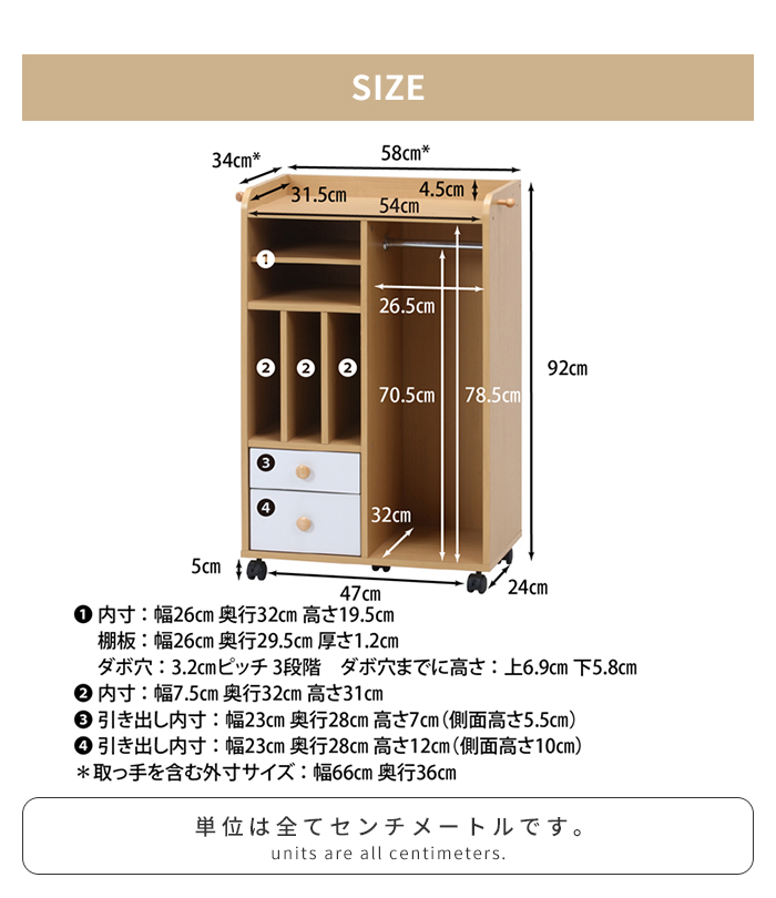 | [オープン部(左上)] 内寸:幅26×奥行32×高さ19.5cm 棚板:幅26×奥行29.5×厚さ1.2cm ダボ穴:3.2cmピッチ3段階 (ダボ穴までの高さ:上6.95cm/下5.8cm) [オープン部(左下)] 内寸:幅7.5×奥行32×高さ31cm [引出(小)] 内寸:幅23×奥行28×高さ7cm(側面高さ5.5cm) [引出(大)] 内寸:幅23×奥行28×高さ12cm(側面高さ10cm) [オープン部(右)] 内寸:幅26.5×奥行32×高さ78.5(バーまでの高さ:70.5)cm |