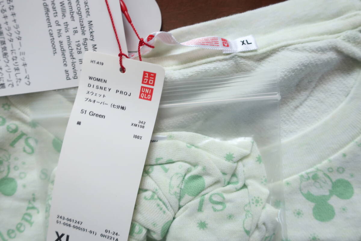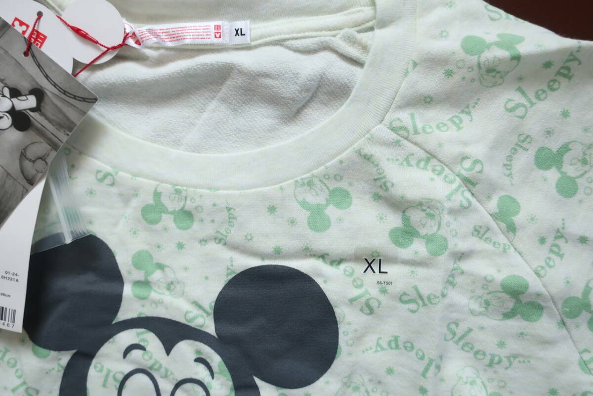 UNIQLO/ユニクロ★ミッキーマウス・薄めスウェットプルオーバー7分袖【XL】グリーン・パジャマ未使用シュシュ付き