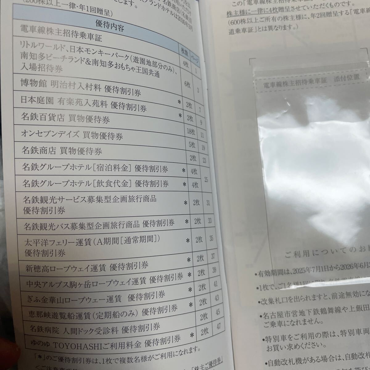 太平洋フェリーの優待は2枚とも欠損しておりますので付属しません。また、名鉄観光サービスと名鉄観光バスは1枚ずつ(残り1枚ずつ)、名鉄百貨店は6枚(残り12枚)欠損しております。