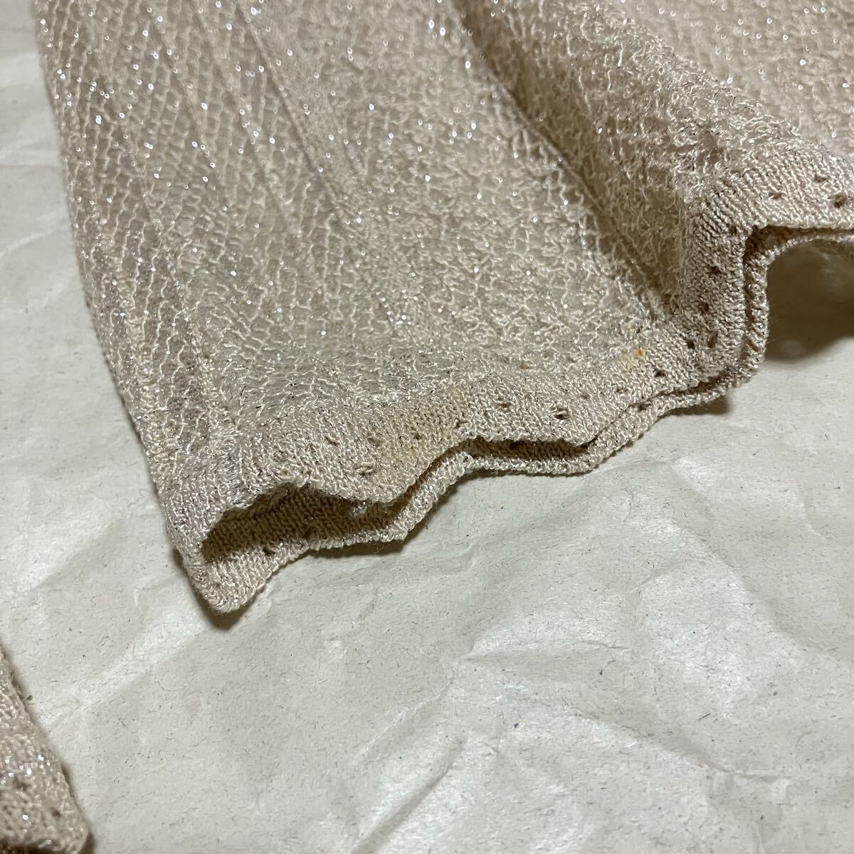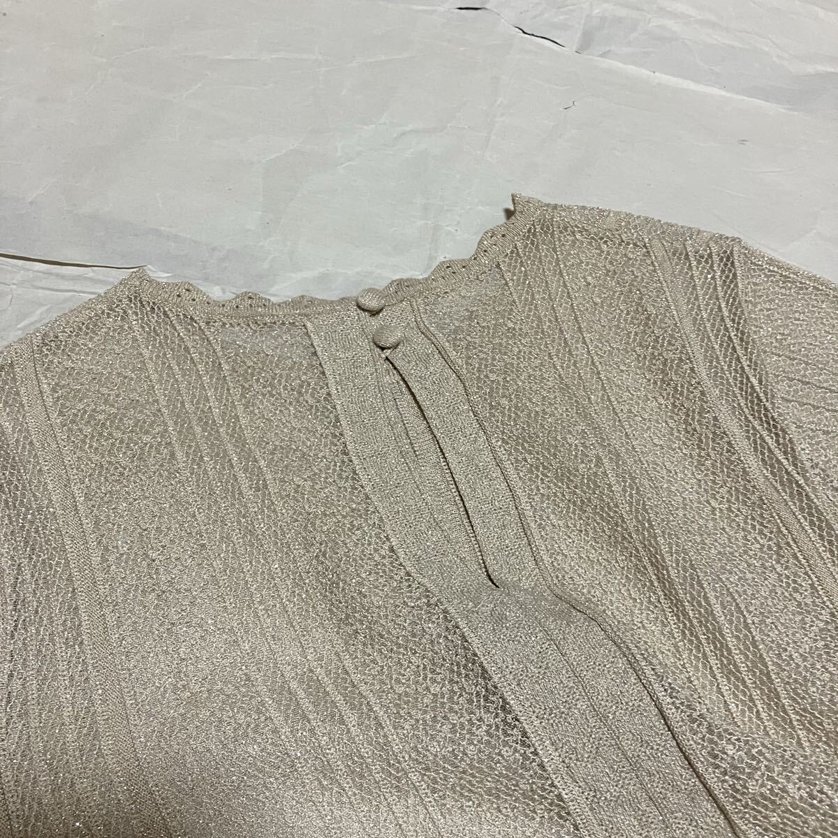 細やかなレース編みを入れているかのような品のあるダブルジャガードニットワンピースが完成しました。シアーで繊細な編み模様を浮かべ、初夏にぴったりな軽やかな表情に仕上げています。凝った編地ながらも形はスッキリとさせ、程よいフレアラインでお作りしているので、ボディラインを美しく演出して女性らしさも高まる1枚です。全色キラキラと上品に光るラメ入りの糸を使用しており、華やかで立ち姿も印象的に演出します。背中側は涙開きで抜け感をだし、くるみボタンを2つ配置して女性らしく仕上げました。