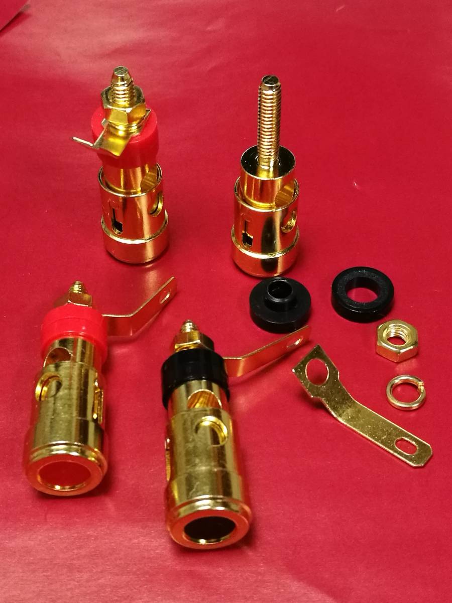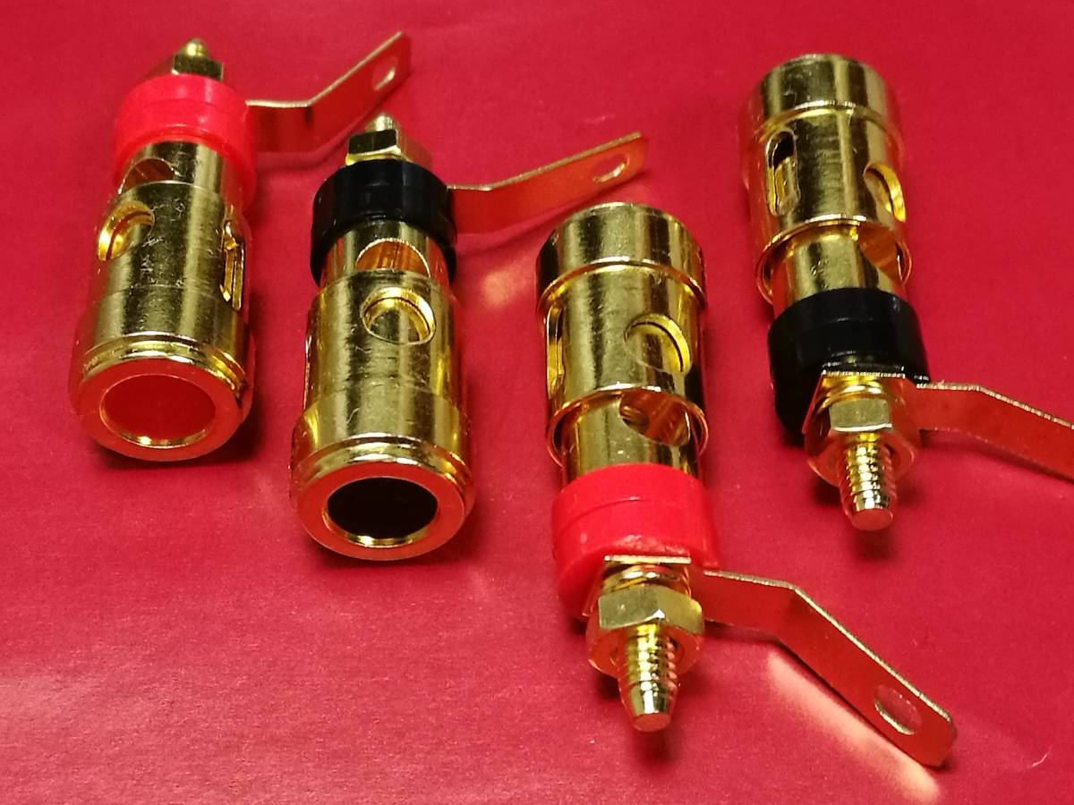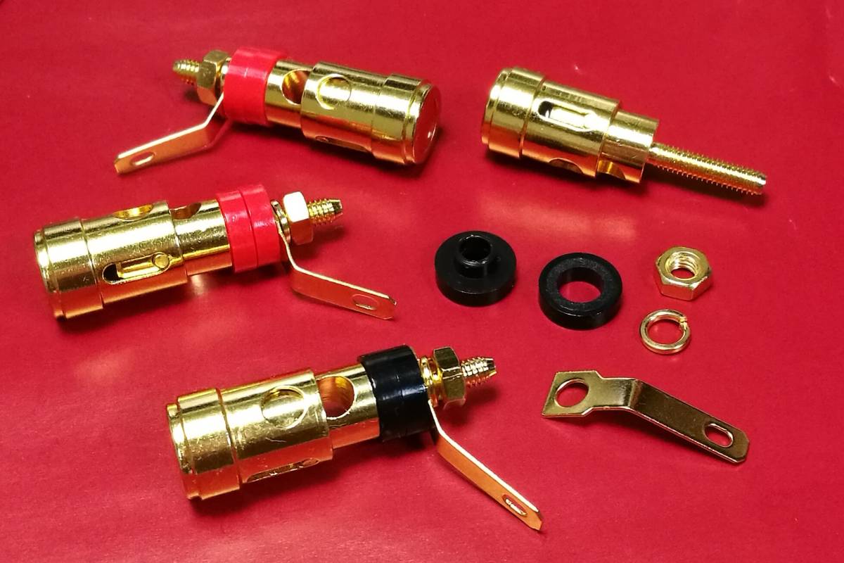 ①ALTECやJBLの業務用スピーカー端子に互換性のあるサイズです。或いはネットワーク並びにボックス端子用にも利用でき、一般オーディオ機器用にも使い勝手の良い金メッキ端子です。