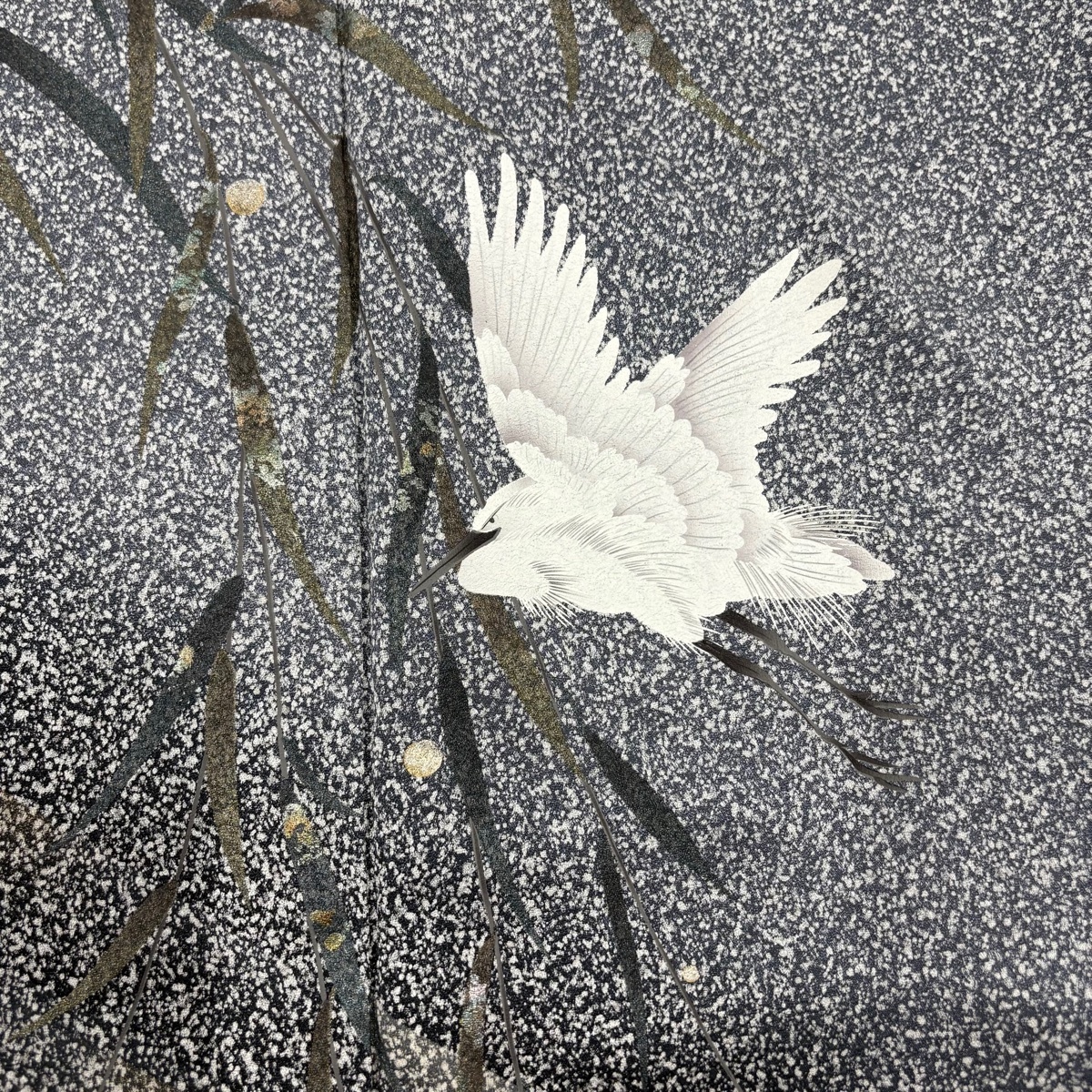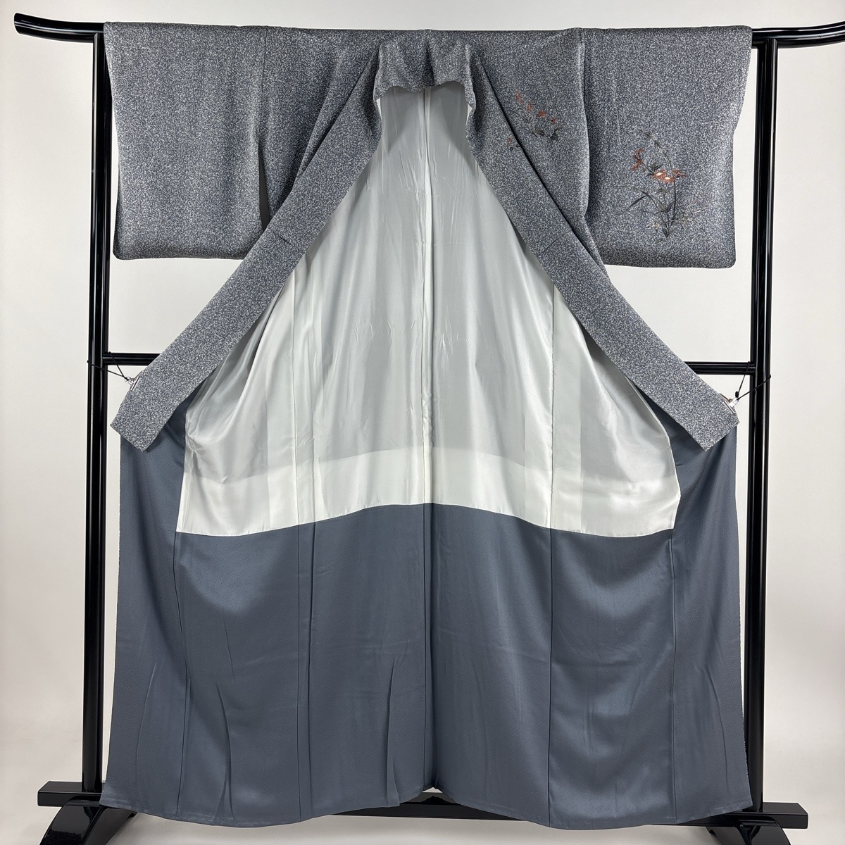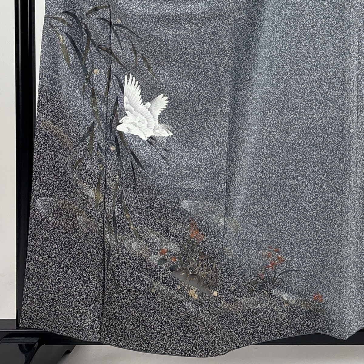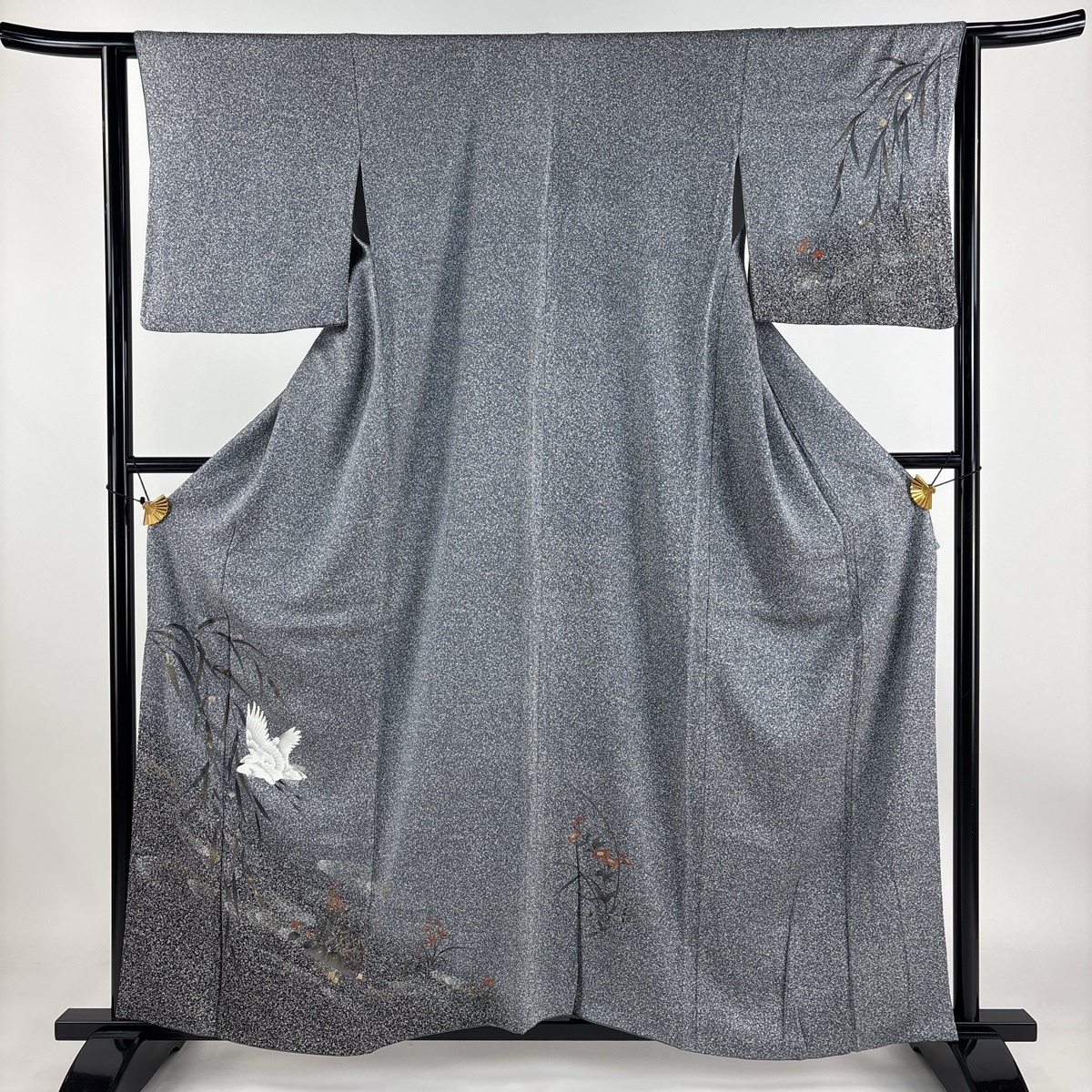 | 付下げ 秀品 白鷺 草花 金銀彩 青灰色 袷 身丈159 裄丈63 S 正絹 【中古】 |