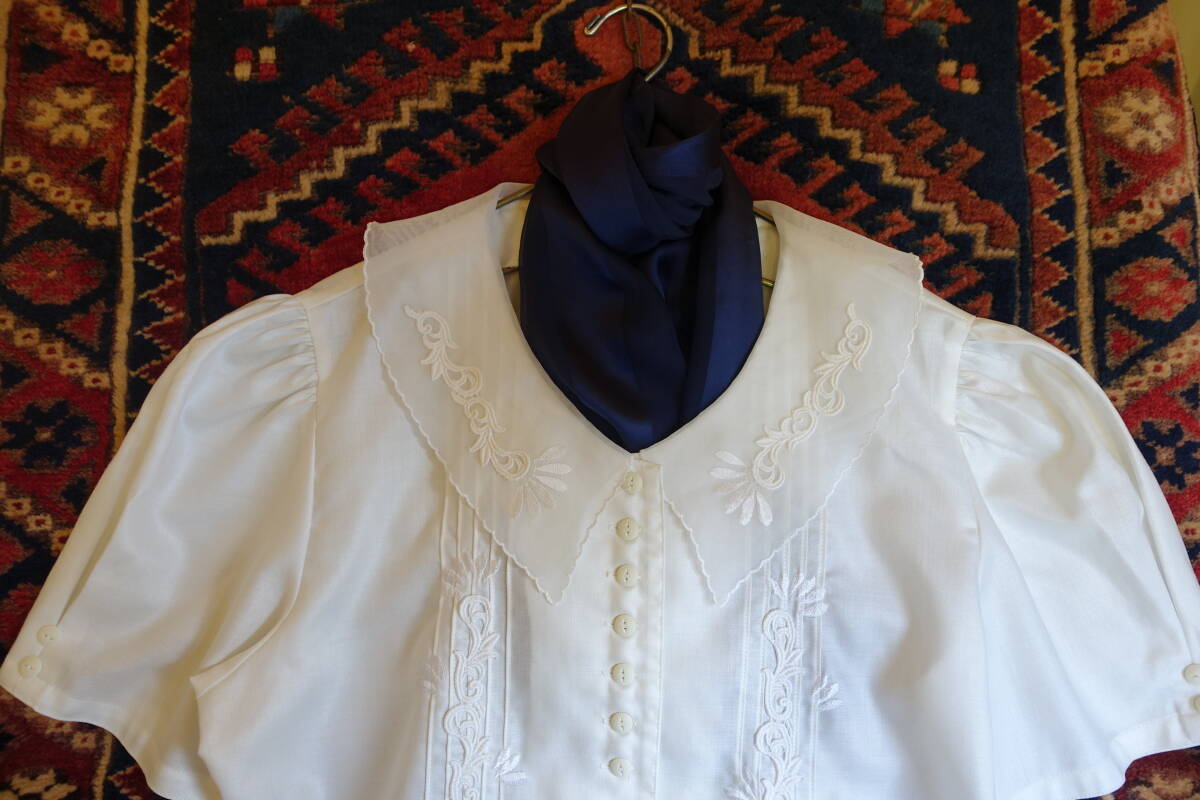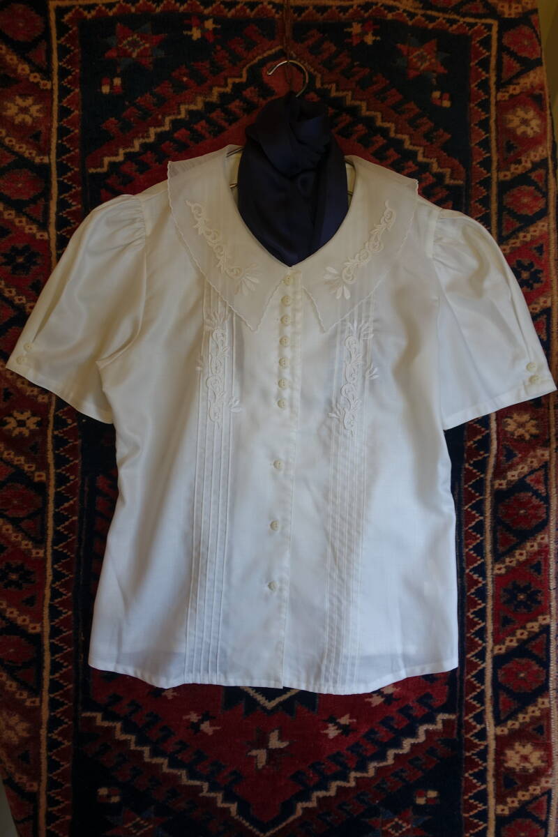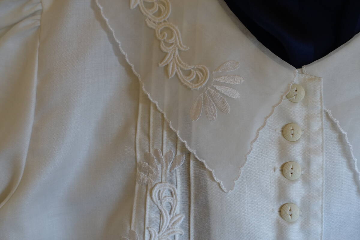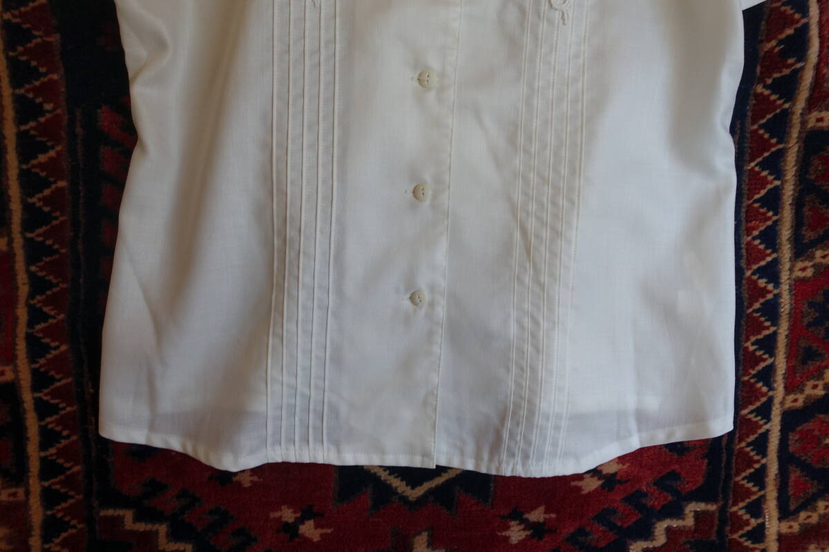 ○[70s80s90s vintage ヴィンテージ 白 シアー襟 レース付き パフスリーブ レトロシャツ]USED古着 昭和レトロ・モダン・モッズ