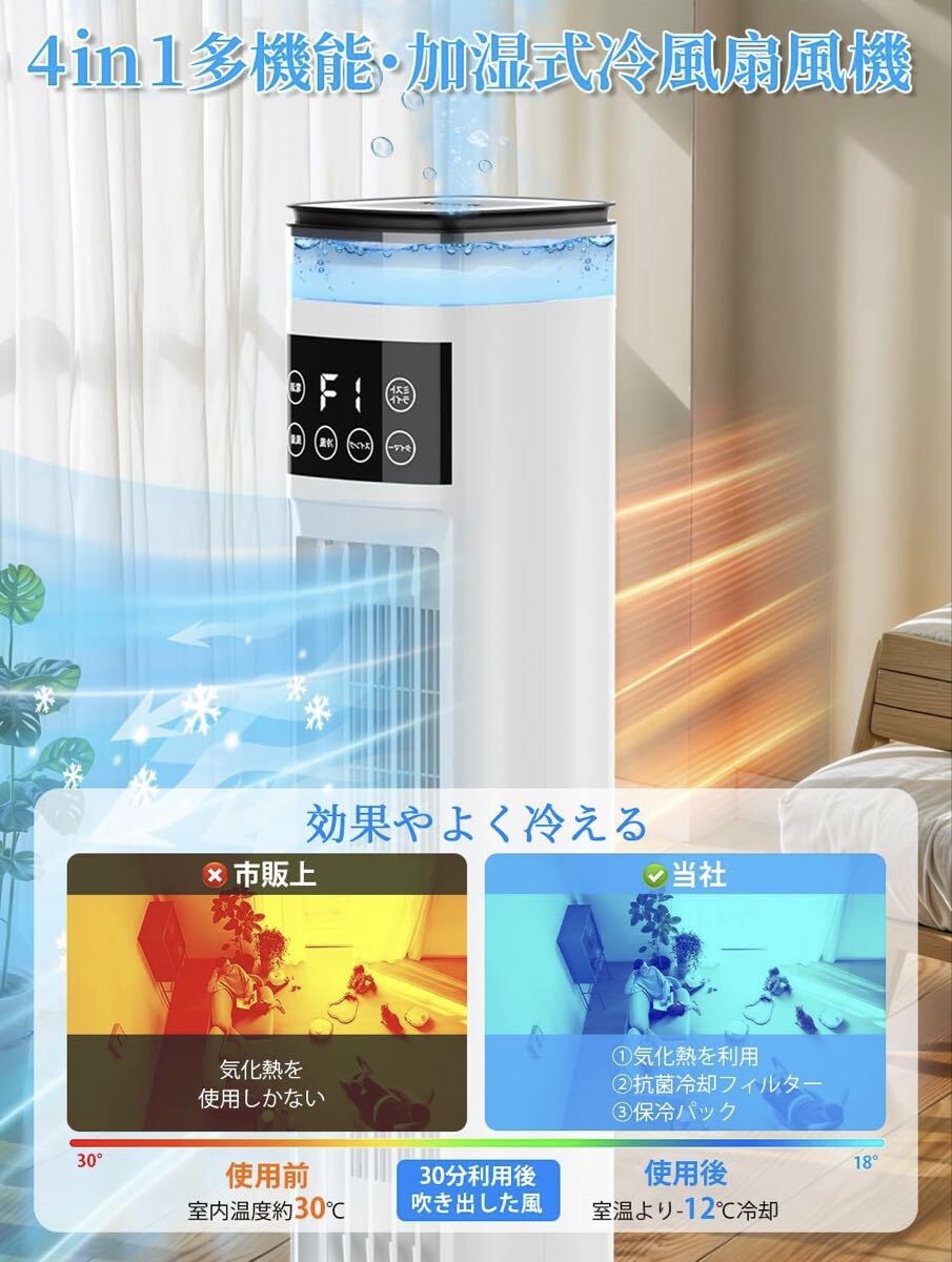 独自構造のタンクで水を循環させ、自然な冷風を生み出す体に優しい冷房器具です。冷風扇は保冷バッグ4つが付きます。最大6.5m/sの送風距離に達し、冷却効率が大幅に向上。冷却・送風・加湿・浄化、合計4つ機能をこの一台冷風機に備えています。