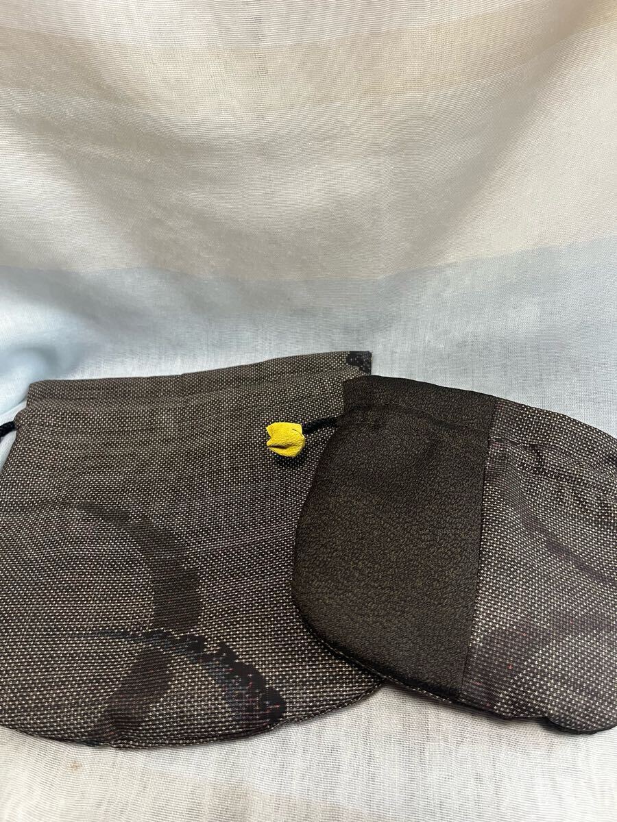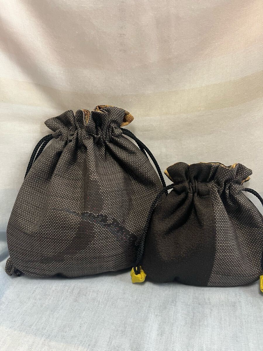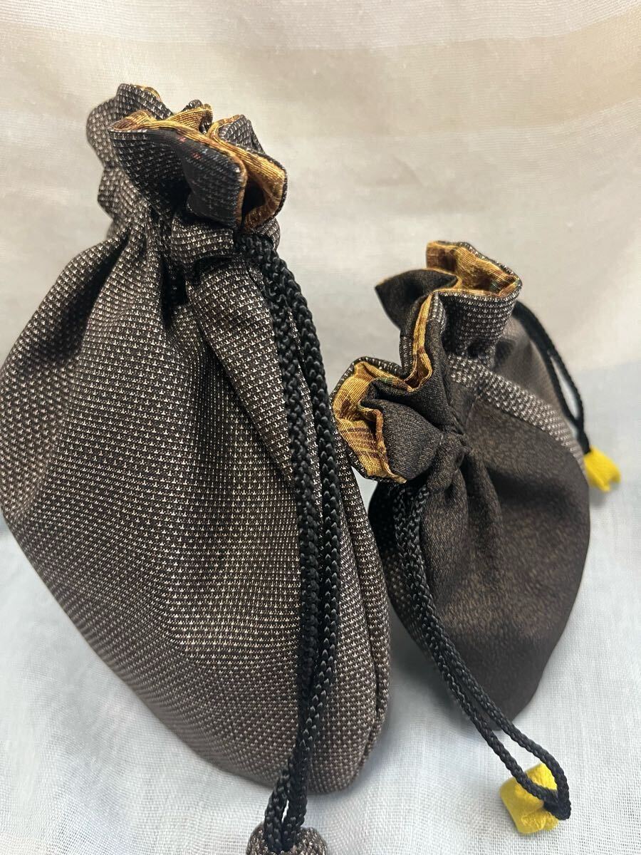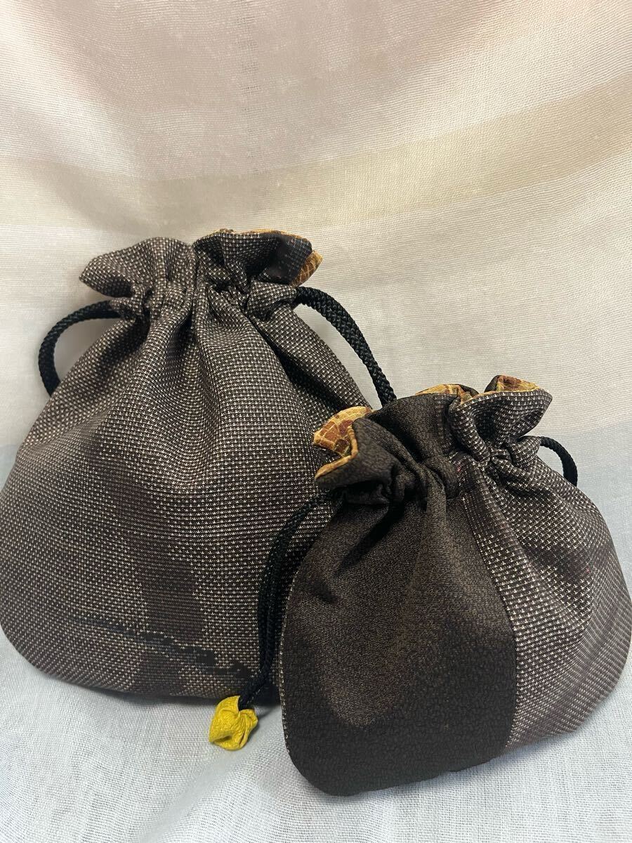 泥大島の着物で作ったサイズ違いの巾着です。
