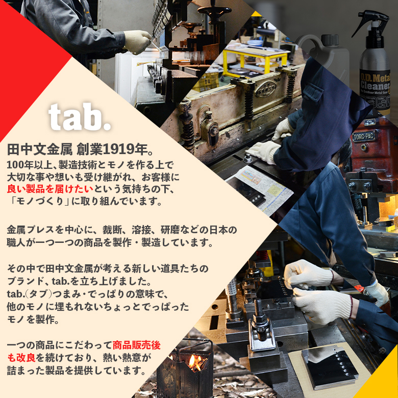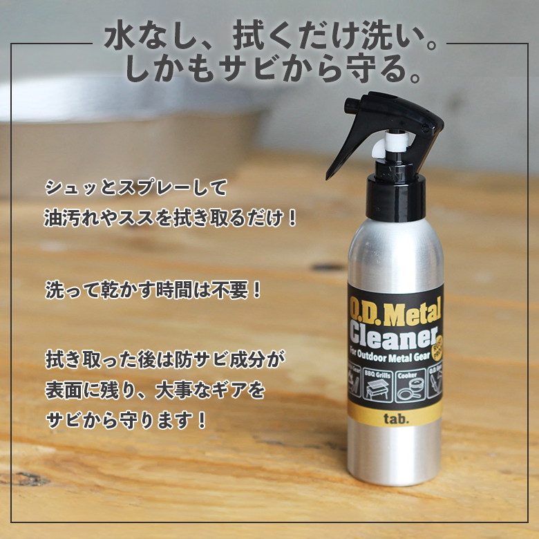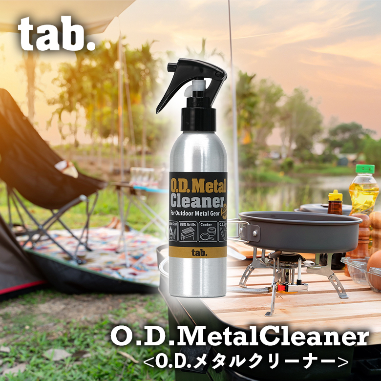「tab.ODメタルクリーナー」は、拭き取り洗浄剤に防サビ成分が配合された、今までにない新しいアウトドア用のクリーナーです。焚き火台やバーベキューグリル、クッカー、ナイフなど、汚れやすく掃除やメンテナンスが面倒なアウトドアギアのために開発されたタブオリジナル!