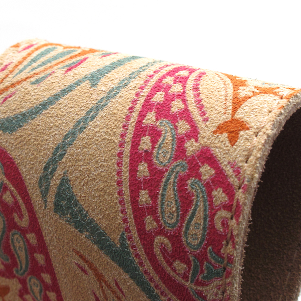 しなやかで柔らかく、肌触りの良いスエードレザーを両面に使用しています。使い込むほどに手になじみ味が増します。 シンプルで高級感あふれる仕上がりです。トップのスエード生地はペイズリー柄に着色されています。バックはナチュラルスエードです。幅の広いタイプです。