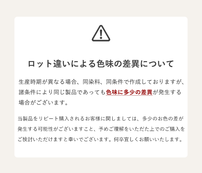 | 同製品であってもロット違いによる色味の差異が発生する場合がございます。 ※当製品をリピート購入されるお客様に関しましては、多少のお色の差が発生する場合がございますこと、あらかじめご理解をいただいた上でご購入をご検討いただけますと幸いでございます。 |