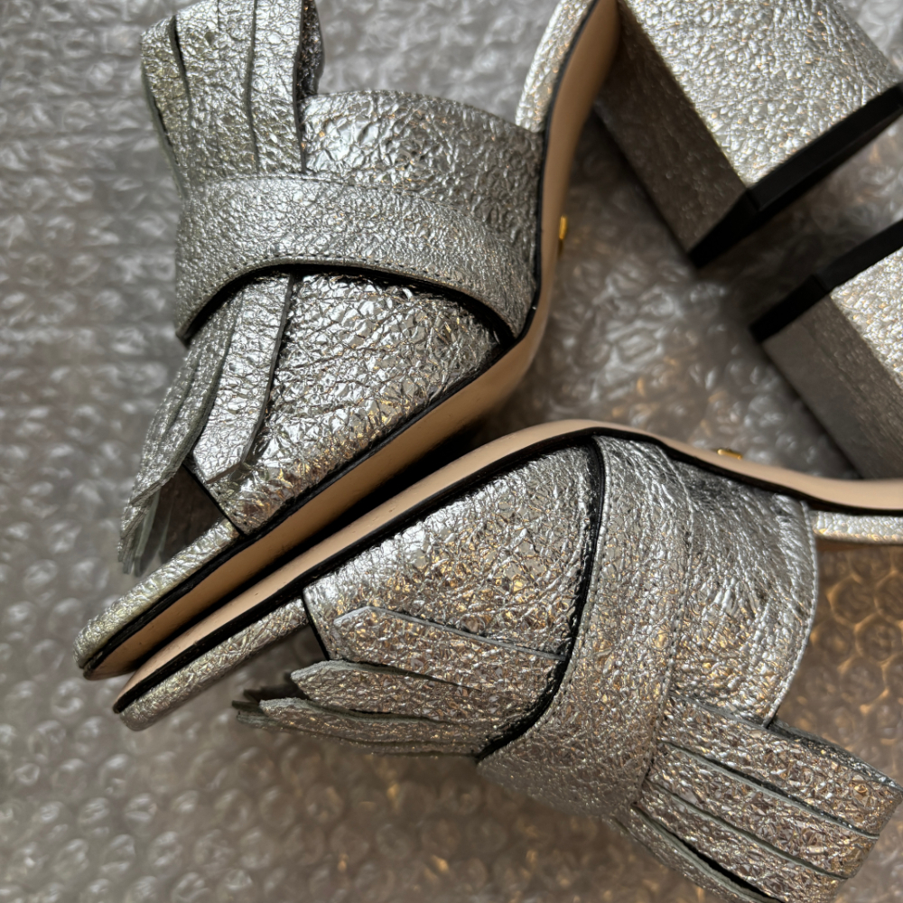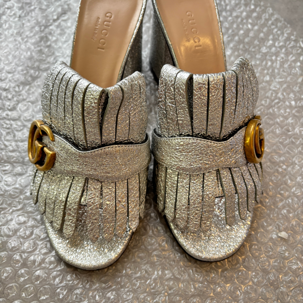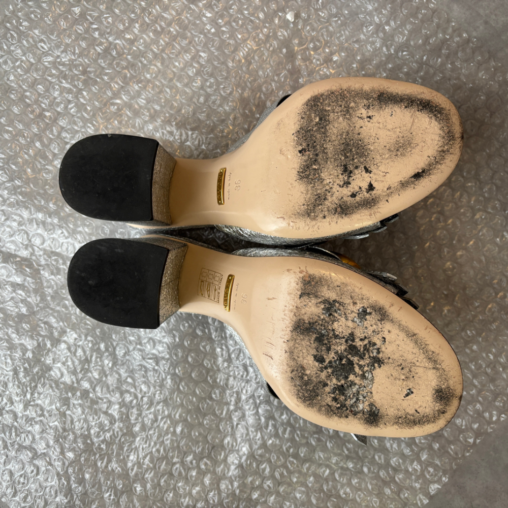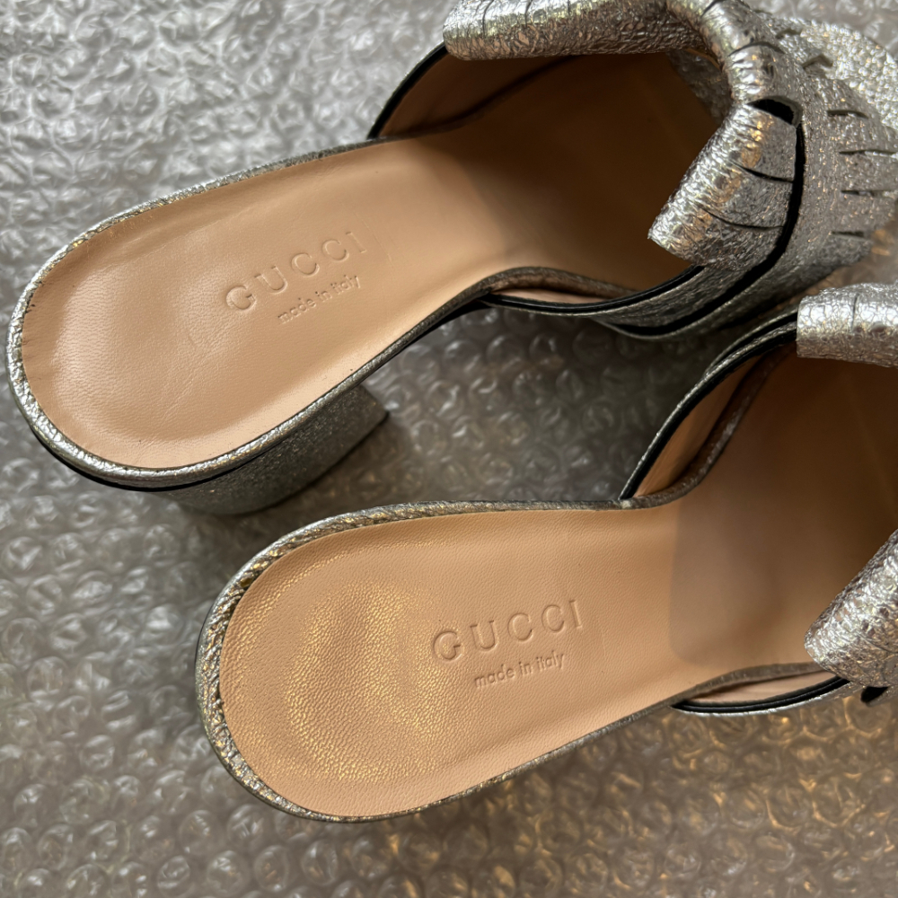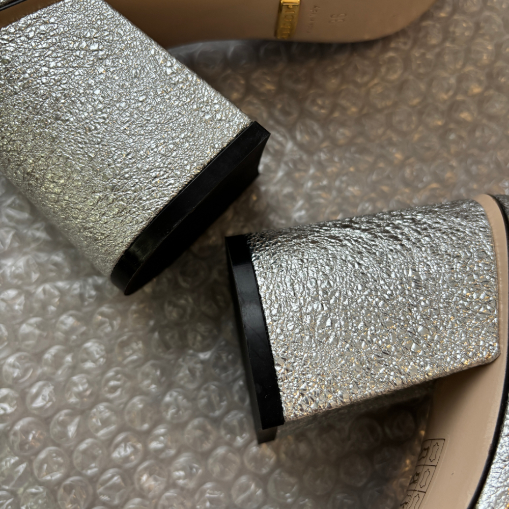 商品名:GUCCI シルバー サンダル ミュール GG ゴールド金具 ラメ ヒール