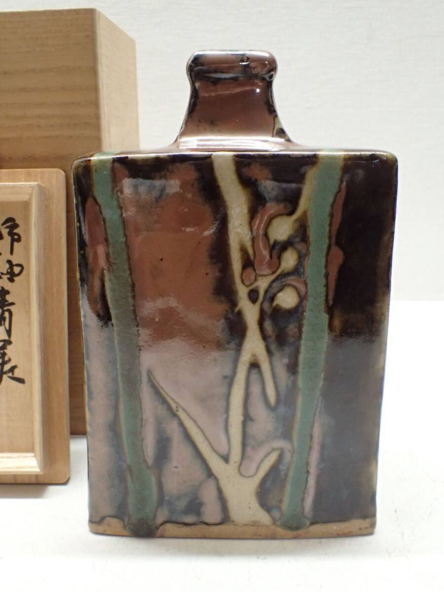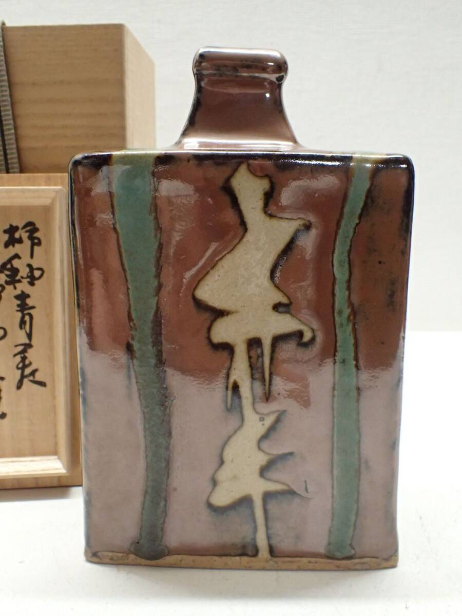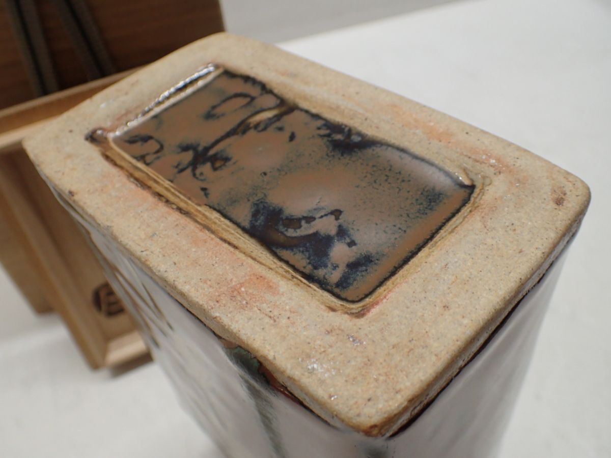 M154/8B〇人間国宝 濱田庄司 柿釉青差描流扁壺 扁壷 花瓶 花入 共箱〇