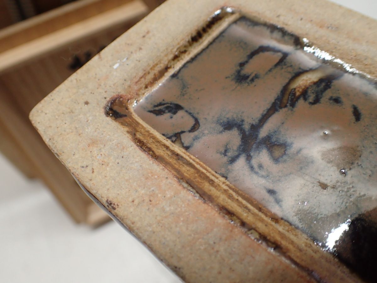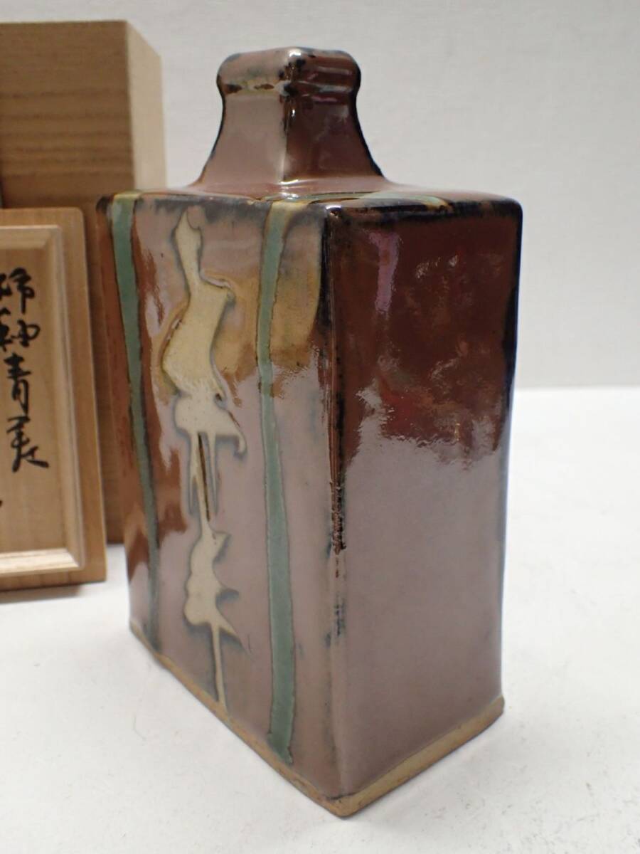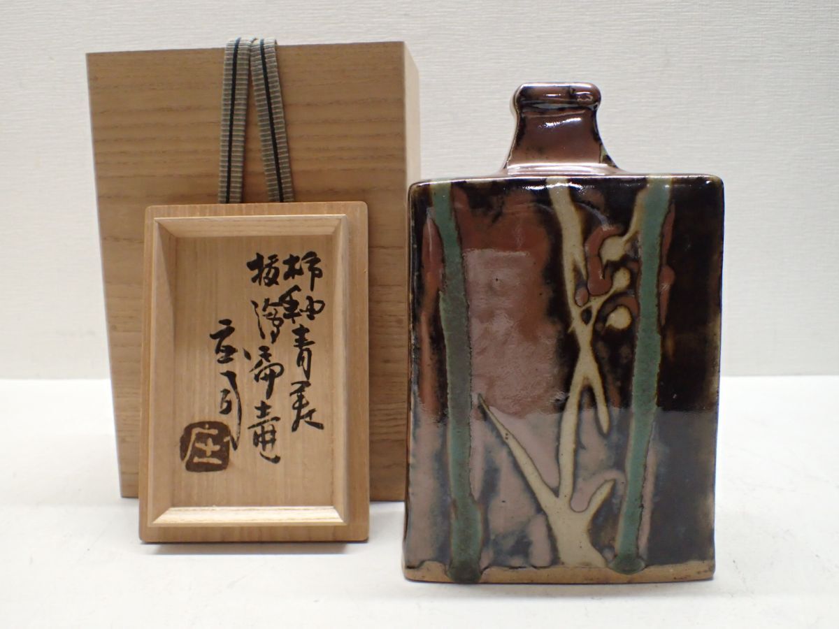 M154/8B〇人間国宝 濱田庄司 柿釉青差描流扁壺 扁壷 花瓶 花入 共箱〇