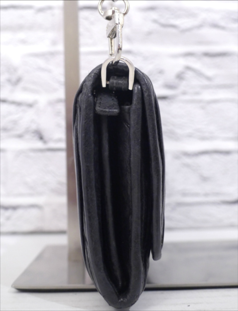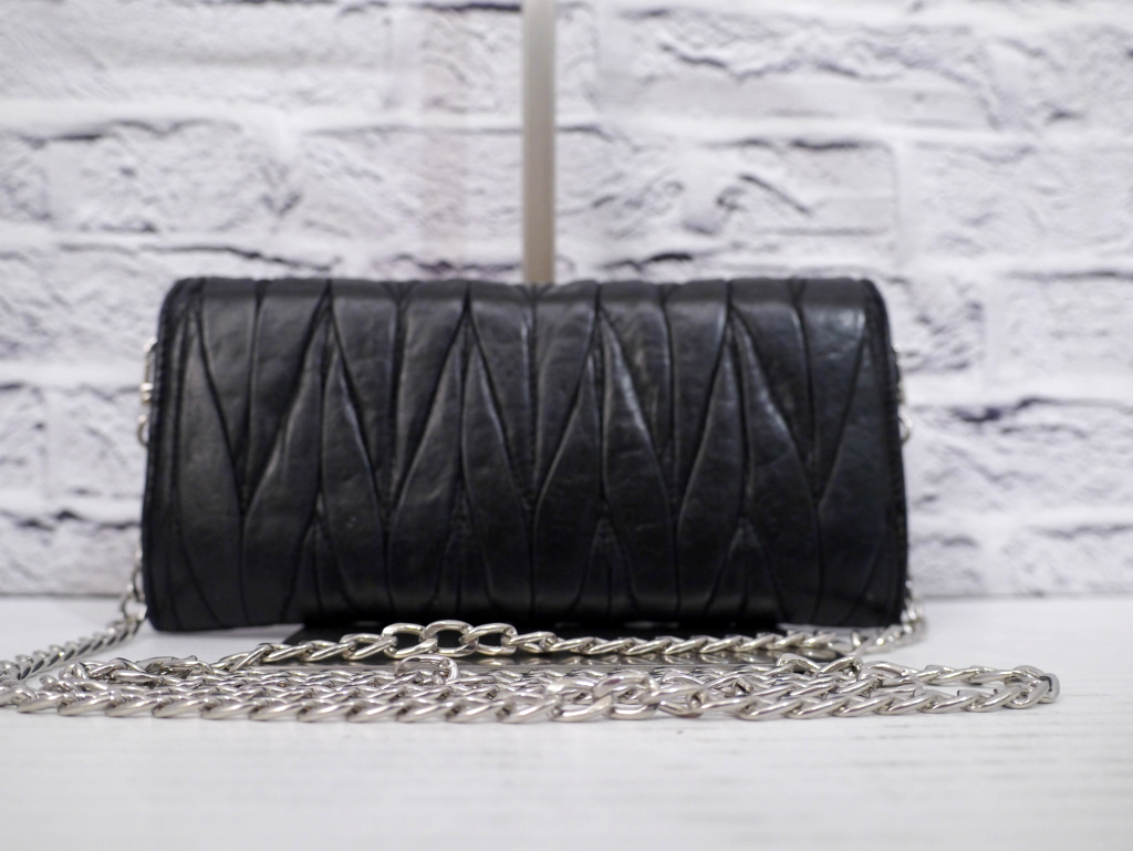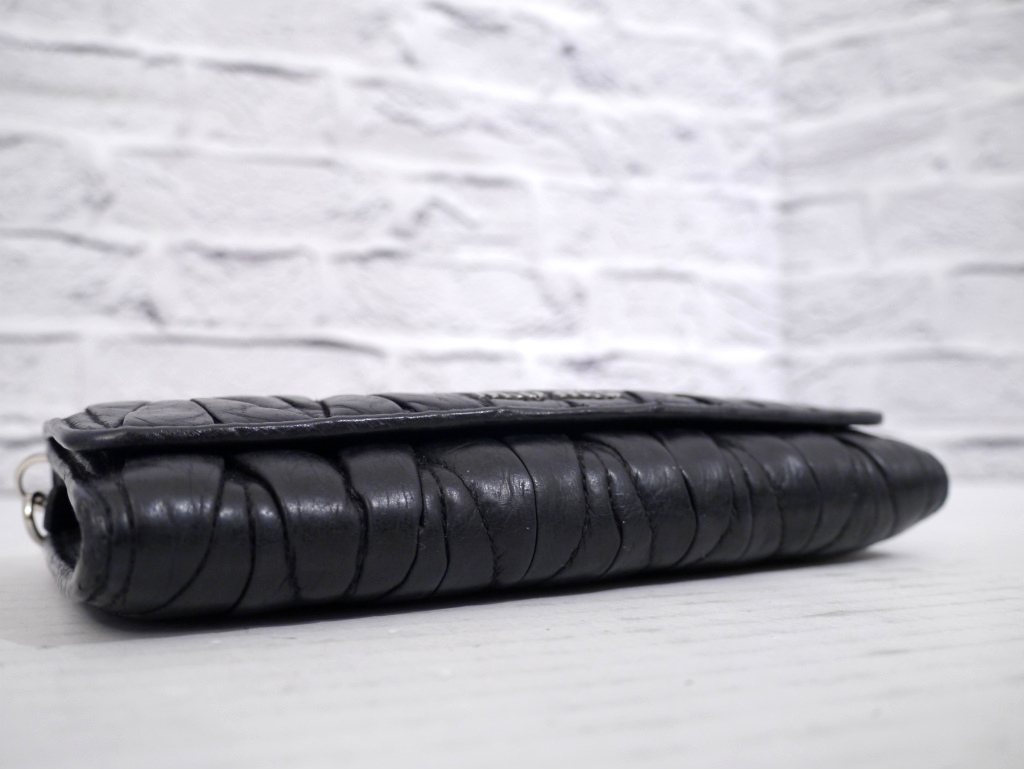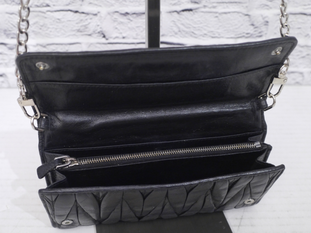 MATELASSEのギャザー感が可愛らしいブラックのレザーにシルバーの【miu miu】ロゴやチェーンストラップがさりげなくが主張し、コーディネートのワンポイントにも取り入れやすいアイテムです。