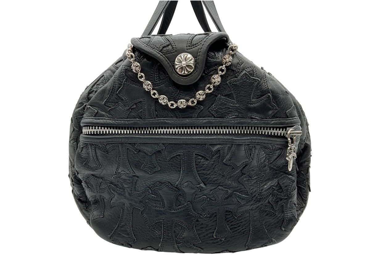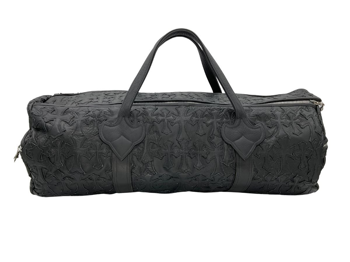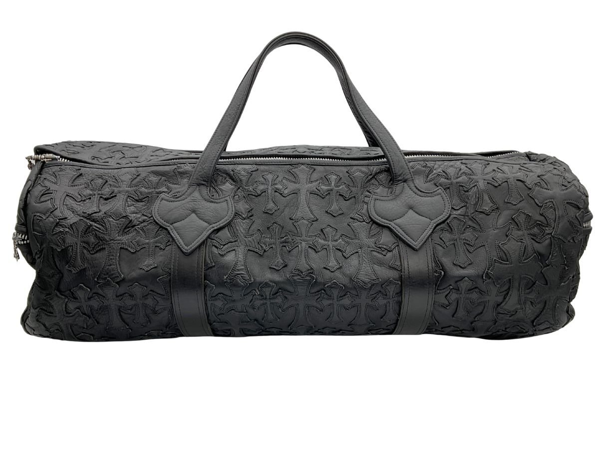 【紹介文】:CHROME HEARTS(クロムハーツ)を象徴するセメタリークロスパッチがバッグ全面に配置された、圧倒的な存在感を誇るレザーダッフルバッグ。重厚なブラックレザーに立体的なクロスモチーフ、サイドのダガージップポケット、フラップにはシルバー925製のクロスボタンとクロスボールチェーンがあしらわれ、ブランドの世界観を体現した1点です。クロムハーツらしい無骨で高級感あるディテールが凝縮されており、バッグとしての実用性とファッション性を兼備。内装にはブランドロゴ入りのジャカードライニングとジップポケットを備えています。さらに、このコンディションで現存する個体は非常に少なく、希少価値の高いコレクターズピースとなっております。
