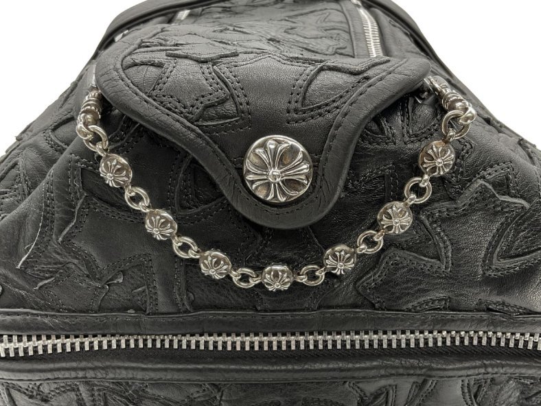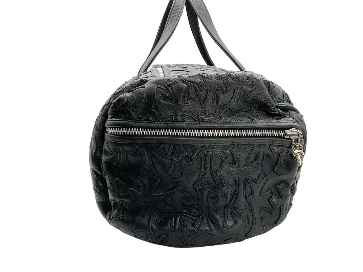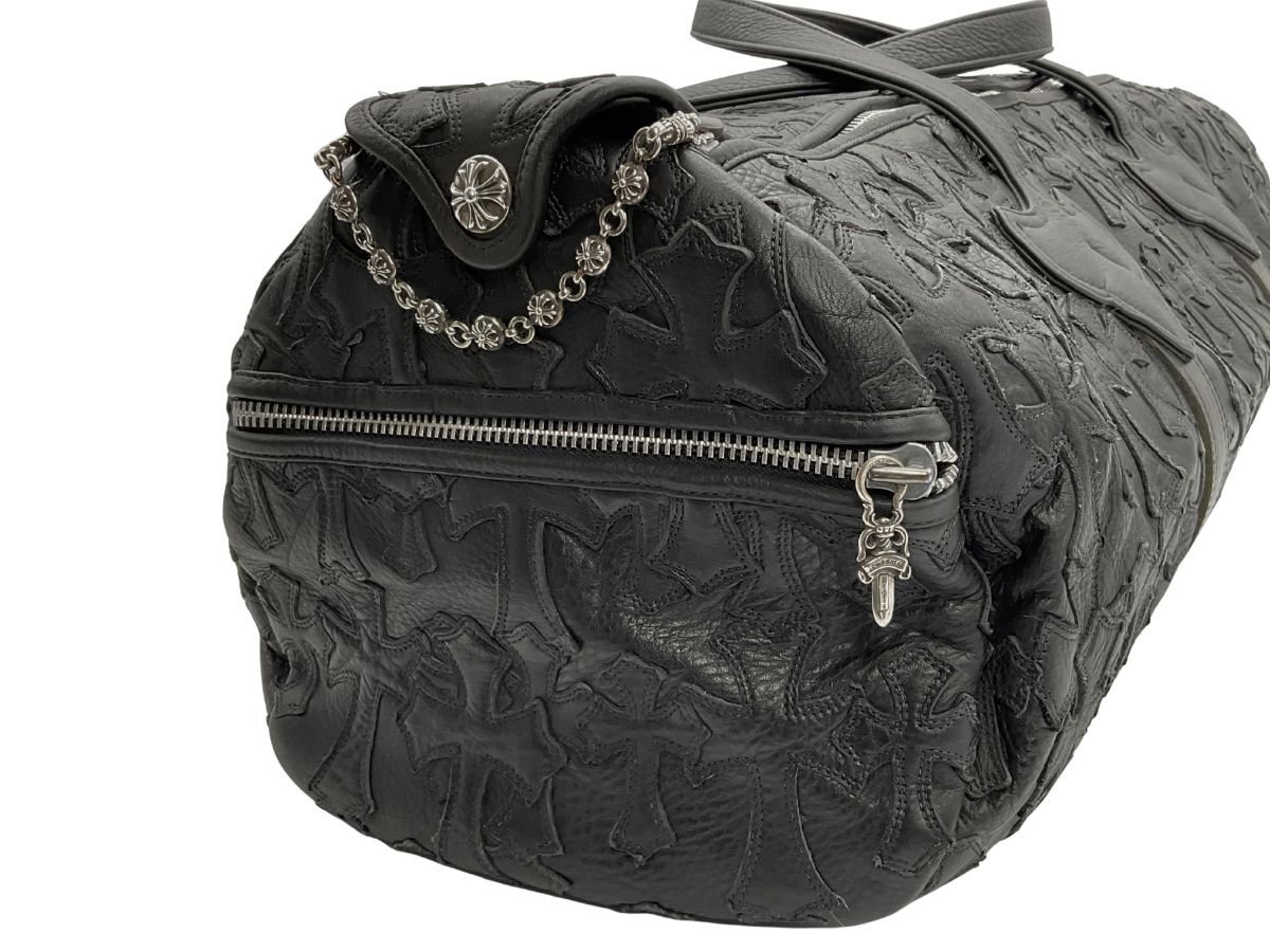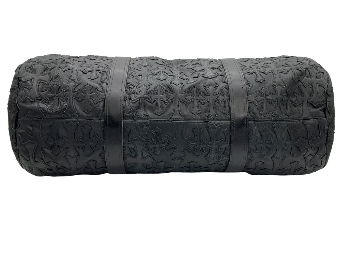 【紹介文】:CHROME HEARTS(クロムハーツ)を象徴するセメタリークロスパッチがバッグ全面に配置された、圧倒的な存在感を誇るレザーダッフルバッグ。重厚なブラックレザーに立体的なクロスモチーフ、サイドのダガージップポケット、フラップにはシルバー925製のクロスボタンとクロスボールチェーンがあしらわれ、ブランドの世界観を体現した1点です。クロムハーツらしい無骨で高級感あるディテールが凝縮されており、バッグとしての実用性とファッション性を兼備。内装にはブランドロゴ入りのジャカードライニングとジップポケットを備えています。さらに、このコンディションで現存する個体は非常に少なく、希少価値の高いコレクターズピースとなっております。
