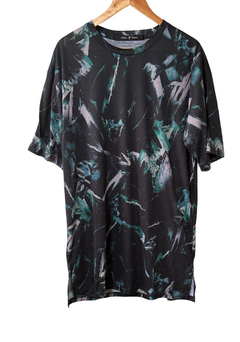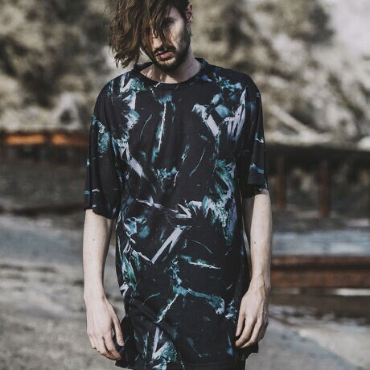 With its abstract, all-over print in shades of green, teal, and black, this tee captures a rugged, natural texture reminiscent of glacial cracks and icy depths.