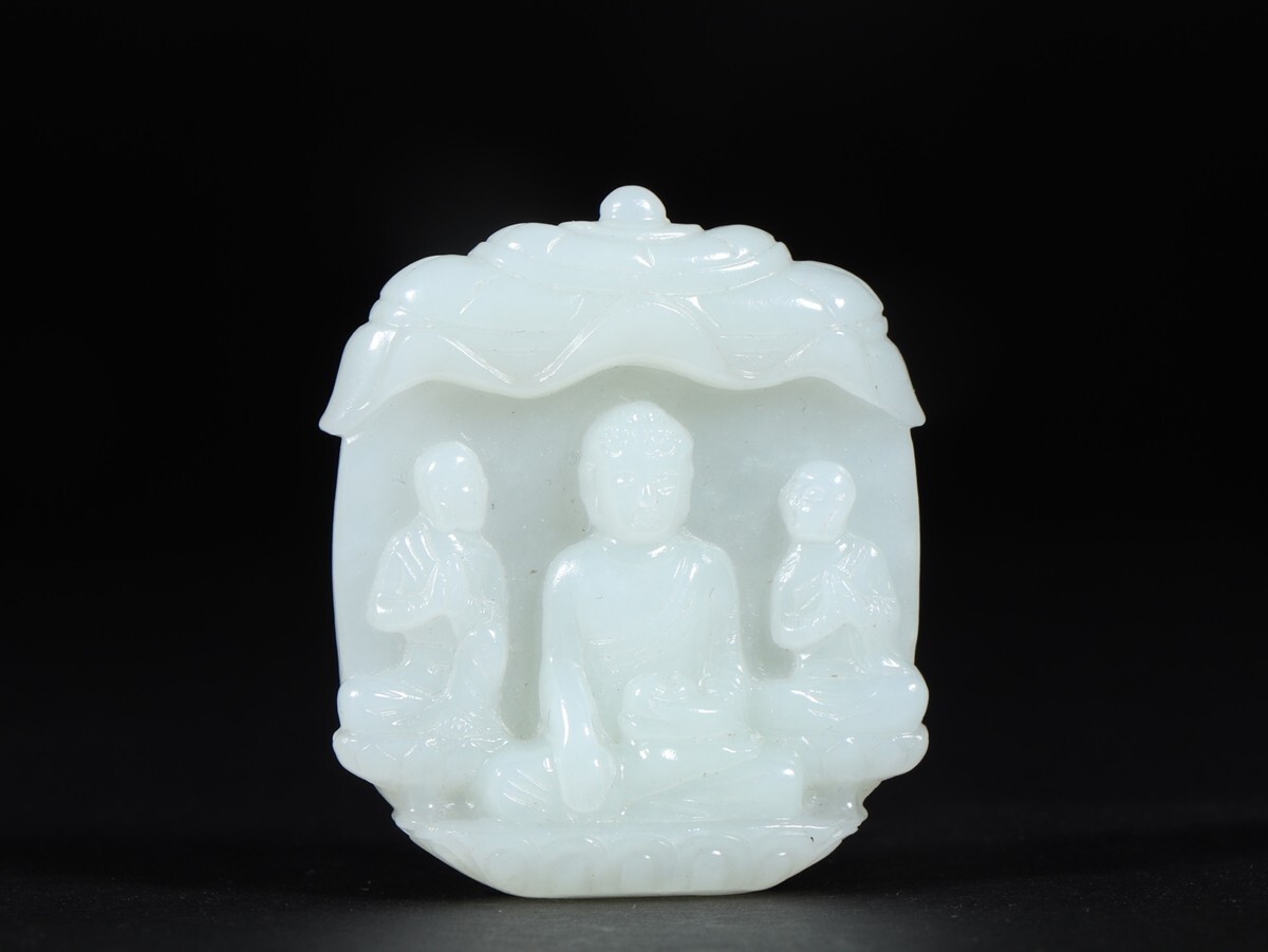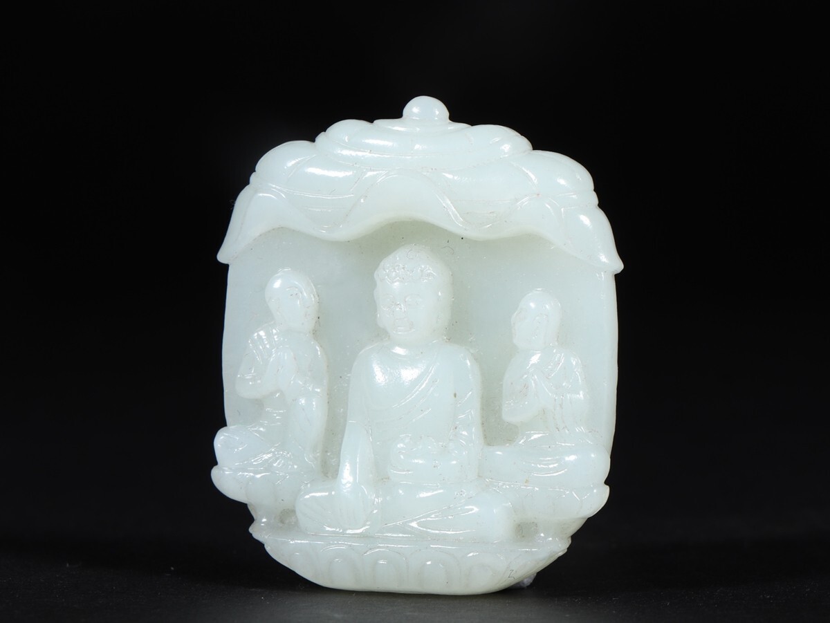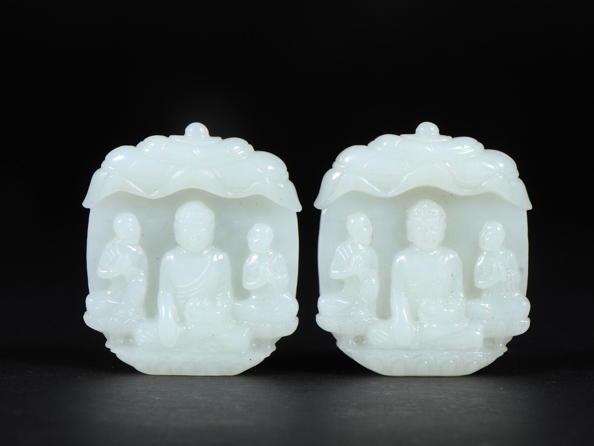 【瓏】和田玉 白玉彫 三聖仏 掛佩一対 清時代 極細工 手彫り 置物 裝身具 賞物 中国古美術 蔵出