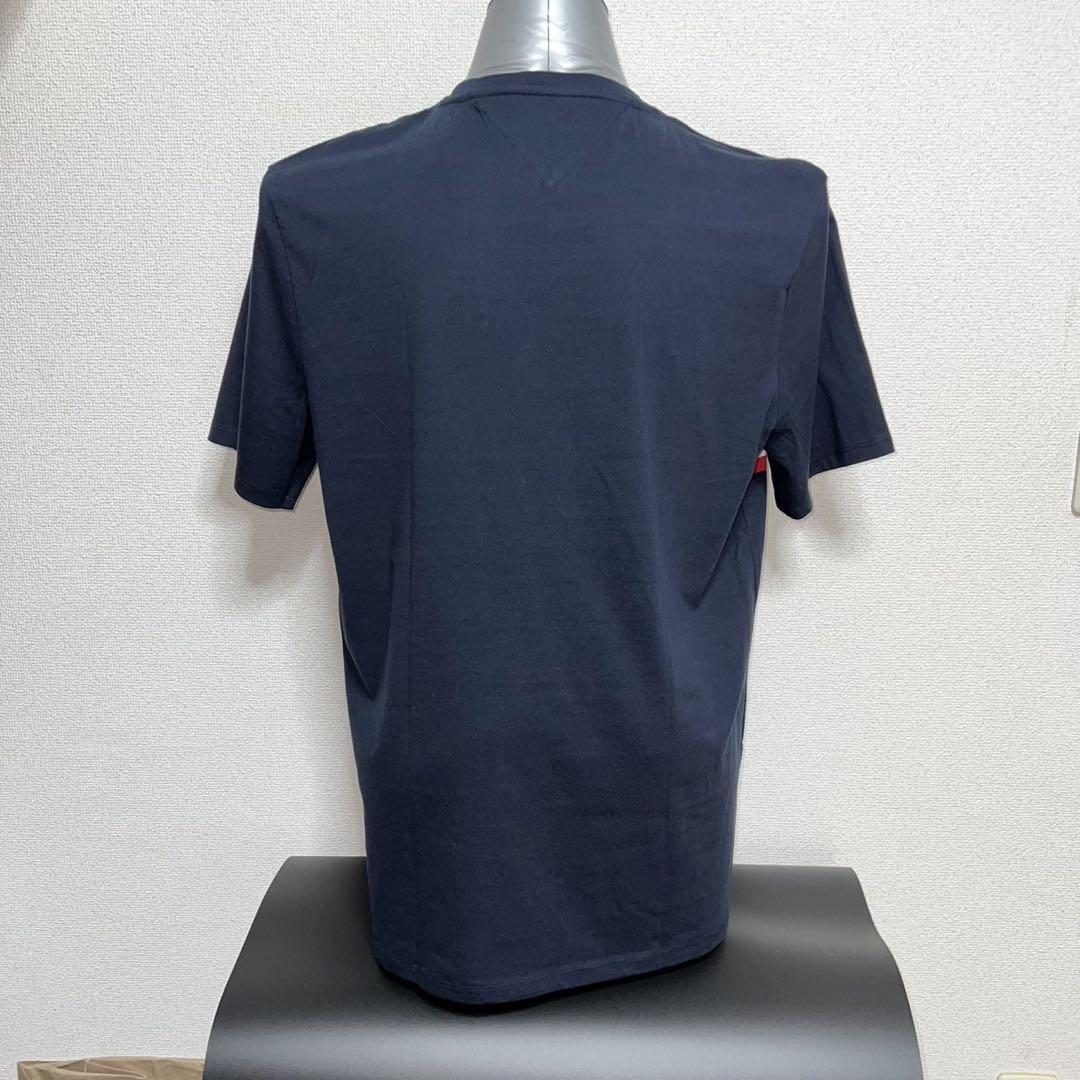 ネイビーのストライプデザインTシャツ、胸元にロゴ付きでスタイリッシュ。