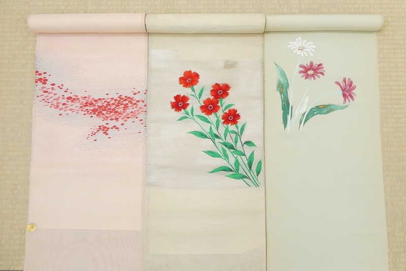 ◆名古屋帯/3点/西陣織・他/夏帯・含/花柄等/リメイク・材料等に/新品/未仕立て/正絹/(梱包サイズ:80)◆* コメント・全体的に薄汚れ・薄い色ヤケがあります。 ・新品ですが、経年保存されていたお品ですので、ご理解のある方のご入札をお願い致します。 ・シミ、ヤケ等の難がある為、リメイク・材料・素材用としてのご利用をお薦めします。 ・ ・ * 品質・サイズ -- 着物サイズ目安 -- ・証紙番号:68、101 ・ ・ ・※一部商品のみのお取引はお断り致しております。入札前・落札後に一部の商品のみのお取引交渉や発送方法(メール便等利用)の交渉はご遠慮下さい。サイズ・発送詳細を必ずご確認のうえ、ご理解・ご納得のうえでのご入札をお願い致します。 ・梱包サイズ:80サイズ(発送詳細必読) * 程度 当社基準ランク・・・【4~5】