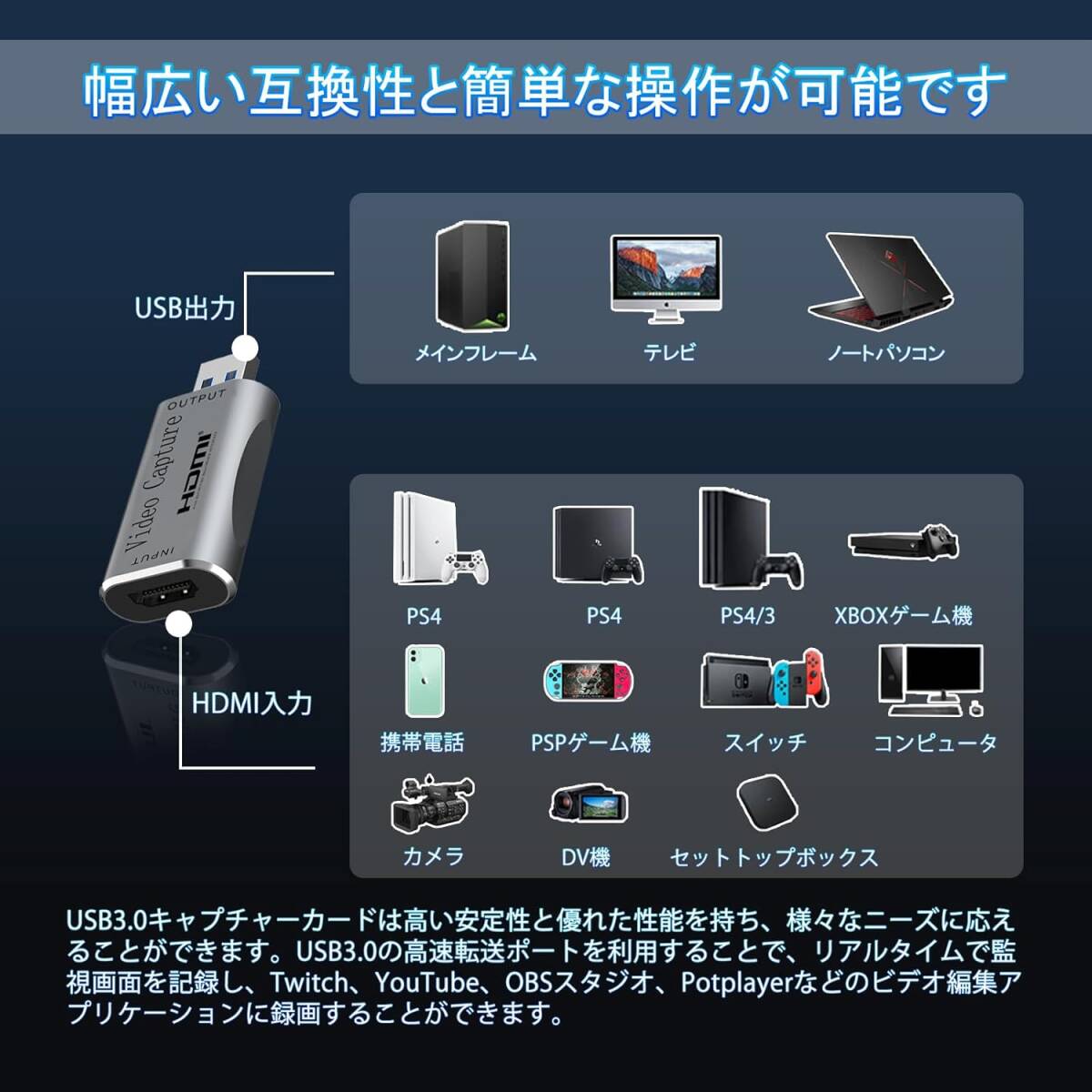 【HDMIキャプチャーカード】HDMIゲームキャプチャーカードは、スマートフォン、ゲーム機、カメラ、テレビ、DVDなどの多くのデバイスの変換に使用できます。これにより、PCやノートパソコンを使用して録画やライブ配信をすることができます。既存のビデオ編集ソフトウェアにも対応し、クリアで遅延のない映像を提供します。また、高品質な映像と音声を実現するため、最新のHDMI2.0規格に対応しています。さらに、外部電源不要のUSBバスパワー接続が可能で、手軽かつスムーズな操作が可能です。当社のHDMIキャプチャーカードは、使い勝手と性能が優れた製品となっております。
