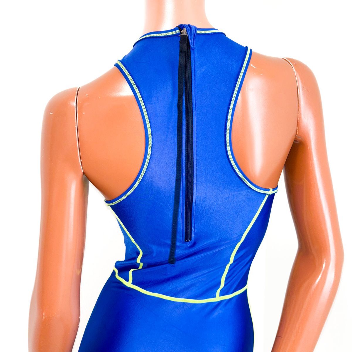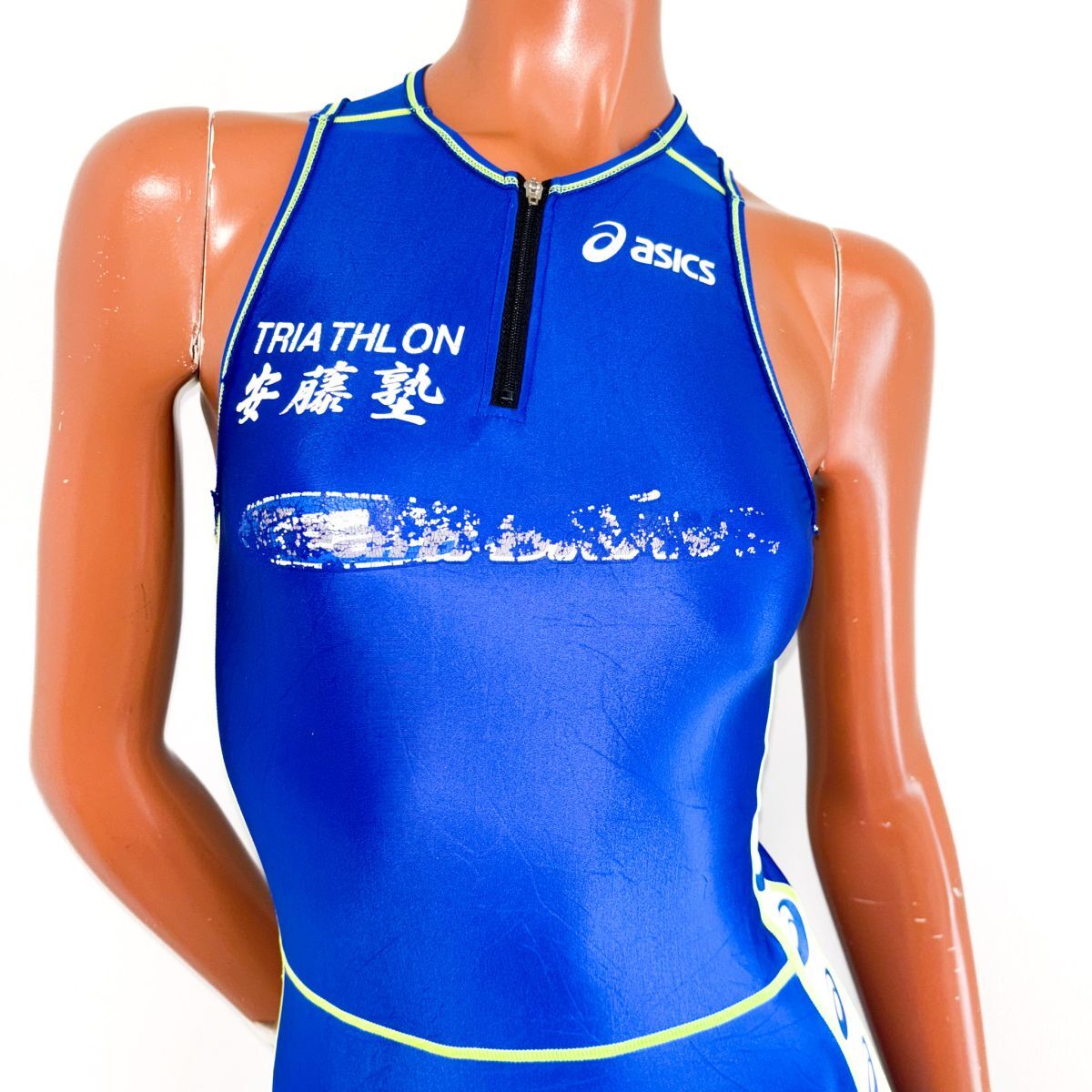 39アシックストライアスロン女子競泳水着S★旧ロゴ ハイドロ★安藤塾マーキング★フロントバックジップ★薄地★超光沢ブルーハーフスパッツ