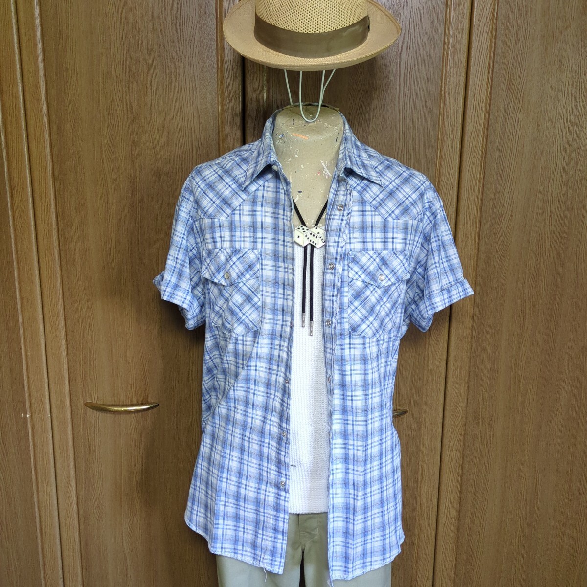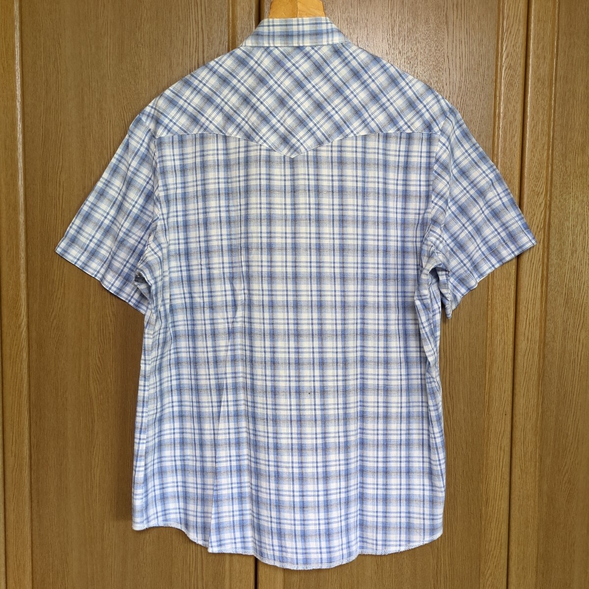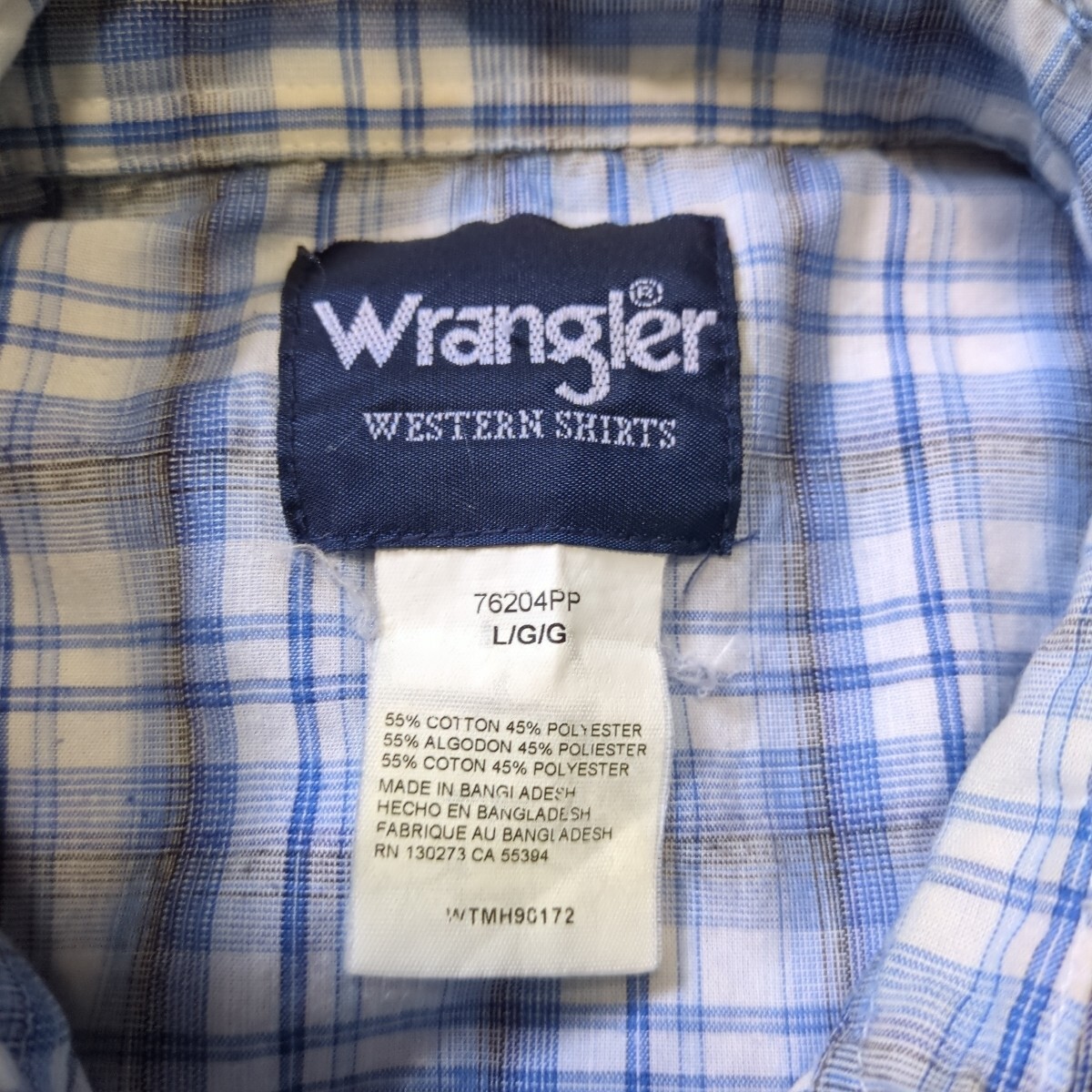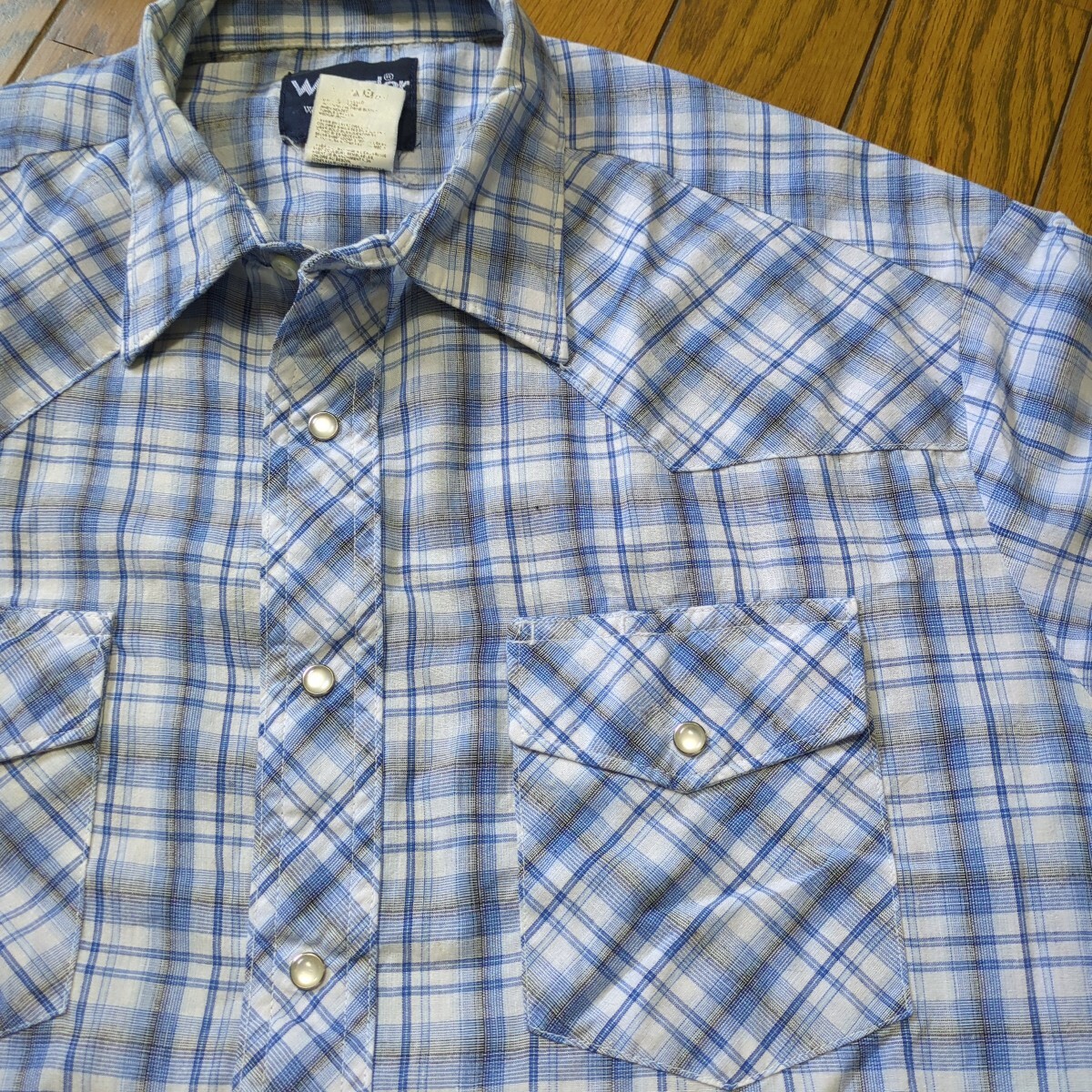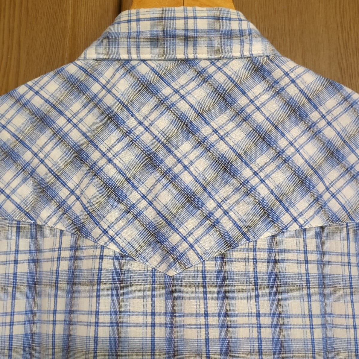 ラングラーのブルー系チェック柄のウエスタンシャツです。表記が薄くなっており不明ですが、おそらくコットンポリ生地かと思われます。薄手のいい生地です。若干の使用感ございますが、特に大きなダメージも無く(チェックしまして生地、スナップボタン等に不備はございませんでしたが、USED品ですので見落とし、ボタンとれがあるかもしれません。USED品ですので、責任は持てません。リペア、ボタン交換等は落札者様でしてください。)、状態良好です。あくまでUSED品になりますので、神経質な方、古着のご理解のない方、入札しないで下さい。メーカーサイズ表記Lサイズで、平置き採寸で、肩幅49センチ、袖丈25センチ、着丈75センチ、脇下身幅61,5センチです。素人採寸ですので多少の誤差はお許しください。