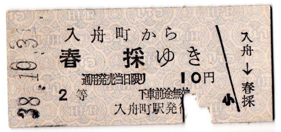 旅客営業廃止最終日 釧路臨港鉄道 入舟町から春採ゆき 2等 10円 入舟町駅発行 パンチ