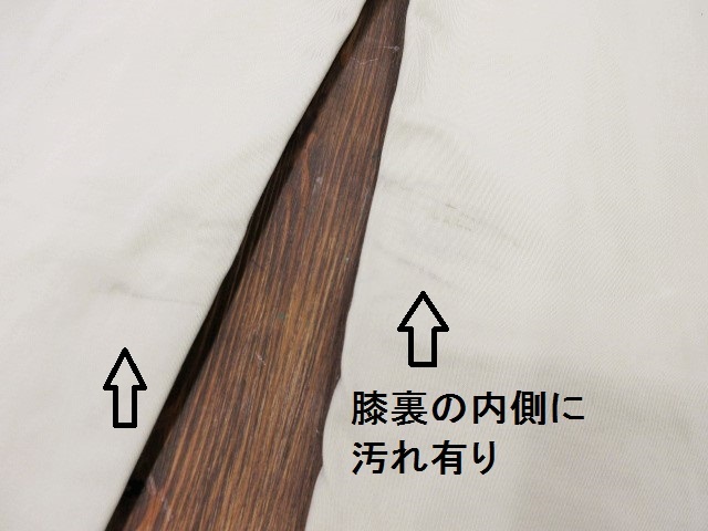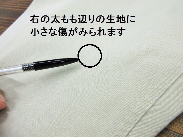 右腿辺りに米粒よりやや小さい生地の傷がみられます。画像にてご確認ください。