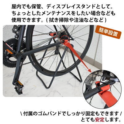 | ロードバイクやマウンテンバイク、クロスバイクなどに最適な自転車1台用スタンド スタンドを開いた状態で、上から車体を乗せるだけで取り付けできるチェーンステーで支えるタイプのメンテナンススタンドです。 室内展示、室内保管用にもご使用頂けます。 メンテナンスの邪魔にならず後輪を浮かせて安定して支えてくれますので 従来のクイックで支えるものより、装着が楽になります。 ・ゴムバンドで車体をとめれるので安定します。 ・クイックに挟むスタンドが苦手な方におすすめ。 ・組立も簡単で、使わないときは折りたたむ事可能です。 本体サイズ 材質:アルミ合金 対応:20インチから700Cまで カラー:ブラック、オレンジフック 付属品:フックx2、取付ネジ 《ご注意》 ・商品は入荷によりキズがある場合があります。 保証対象外になりますのでご了承お願い致します。 ・ディスプレイ環境により実物と色が異なる場合が有ります。 ・入荷時期により予告無く一部仕様変更する場合が有ります。 ・車種、サイズによって取付できない場合がございますので、形状やサイズなどををご確認の上ご購入下さい。 | |