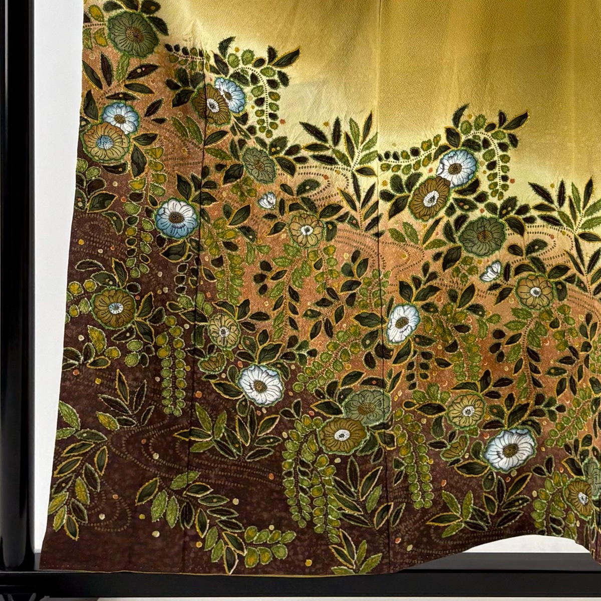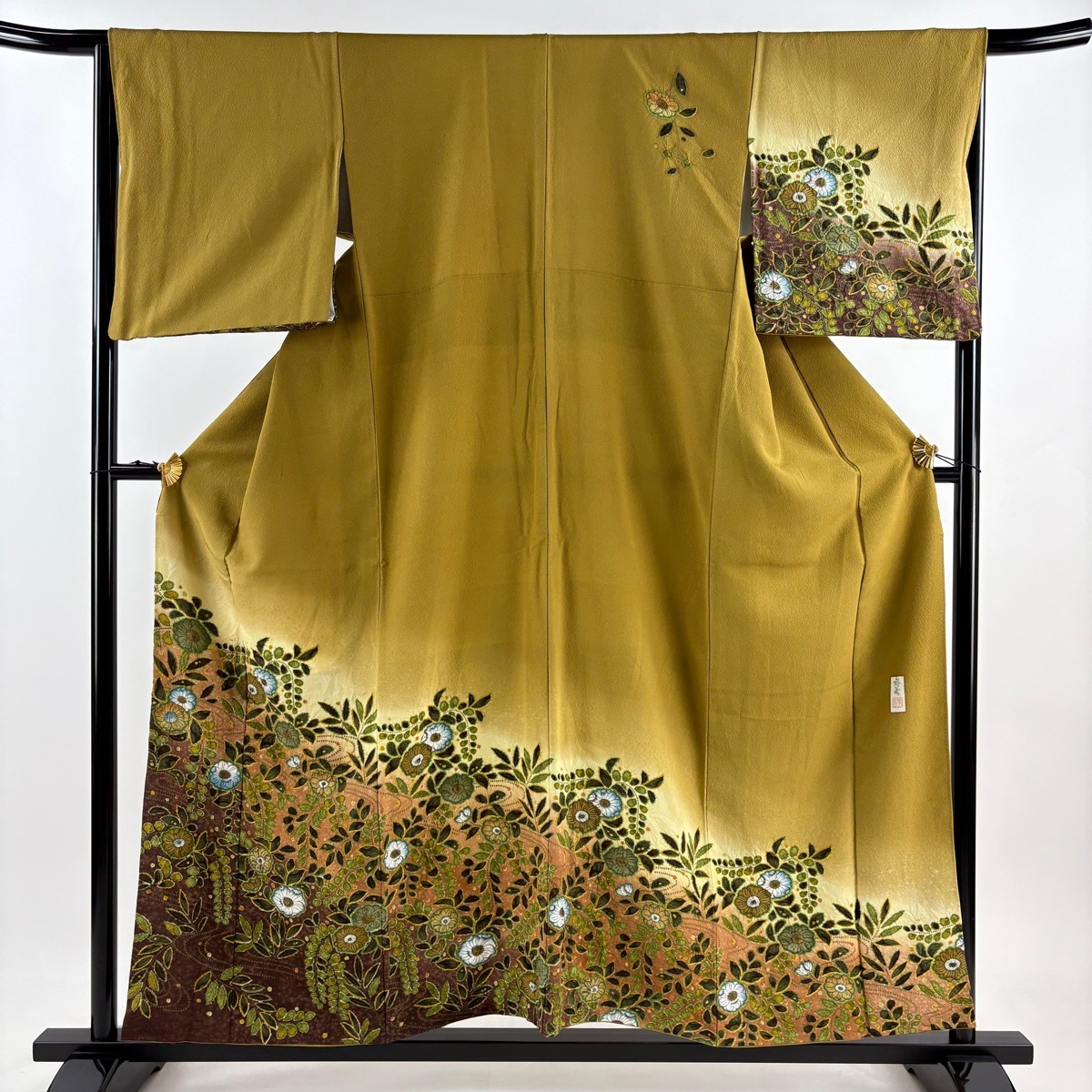 | 訪問着 秀品 落款 辻ヶ花 流水 ぼかし 黄土色 袷 身丈156 裄丈65.5 M 正絹 【中古】 |