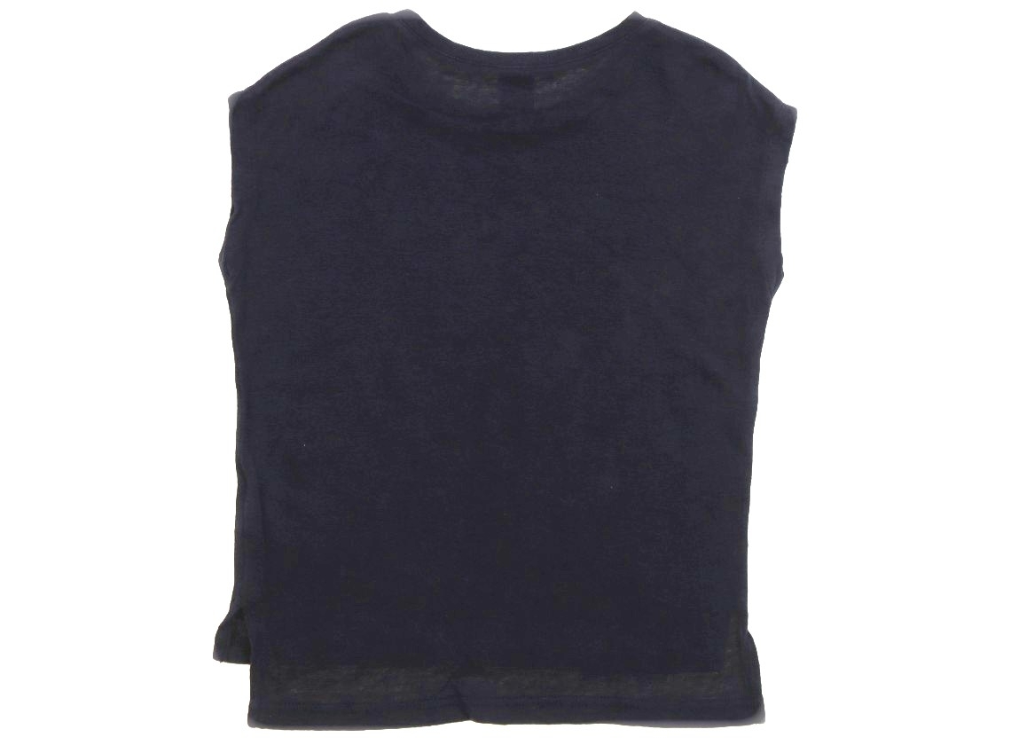 実際のサイズ表記は105(100-110)です。麻・綿の薄手のニット素材。左胸付近に薄っすら白い汚れがありますが、まだまだお使いいただけそうです。浅めの黒です。