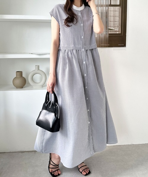 参考商品名:夏にぴったり。ウエストギャザーフレンチスリーブストライプシャツワンピ―ス