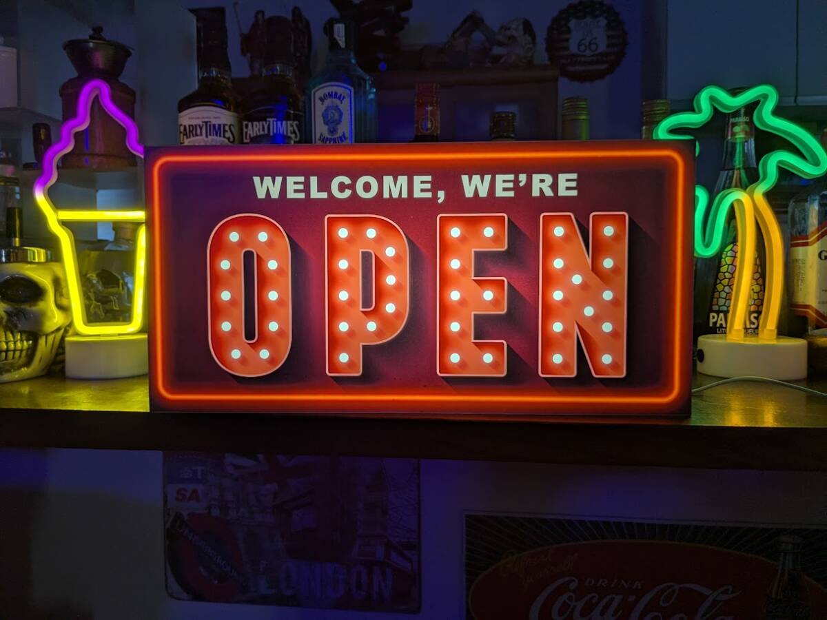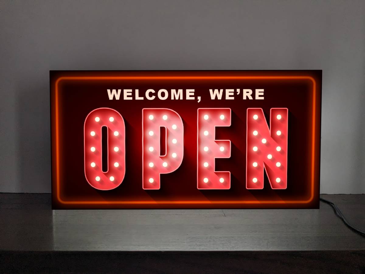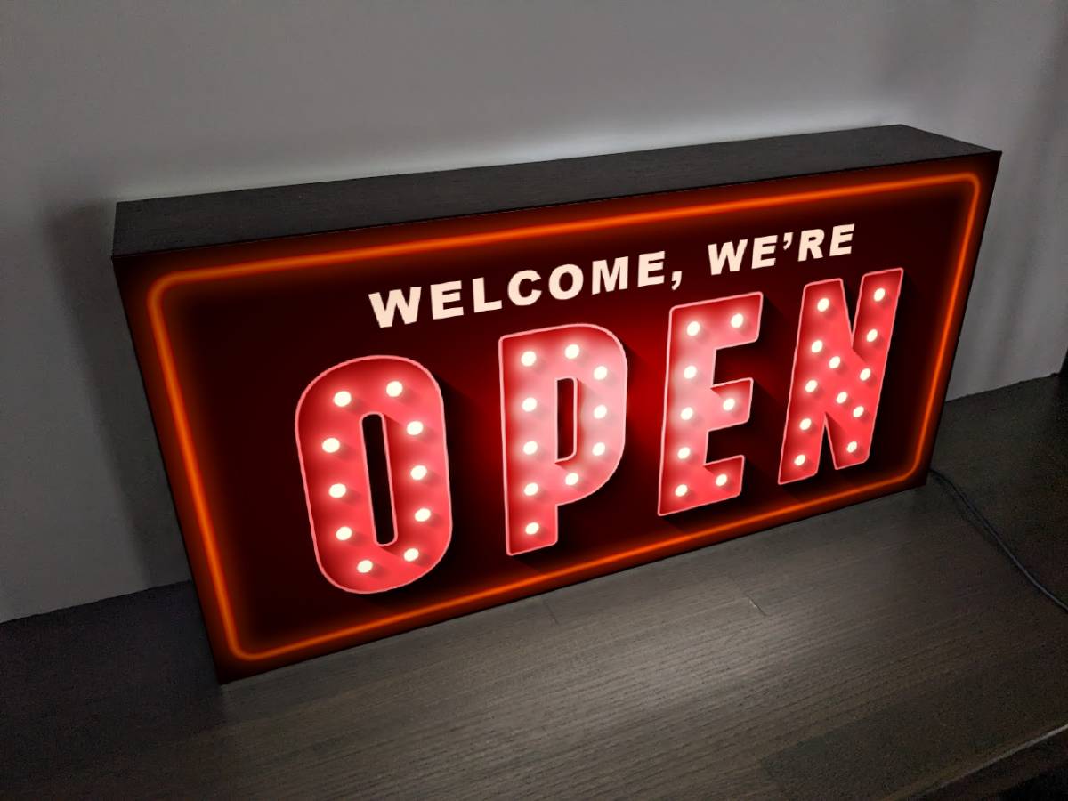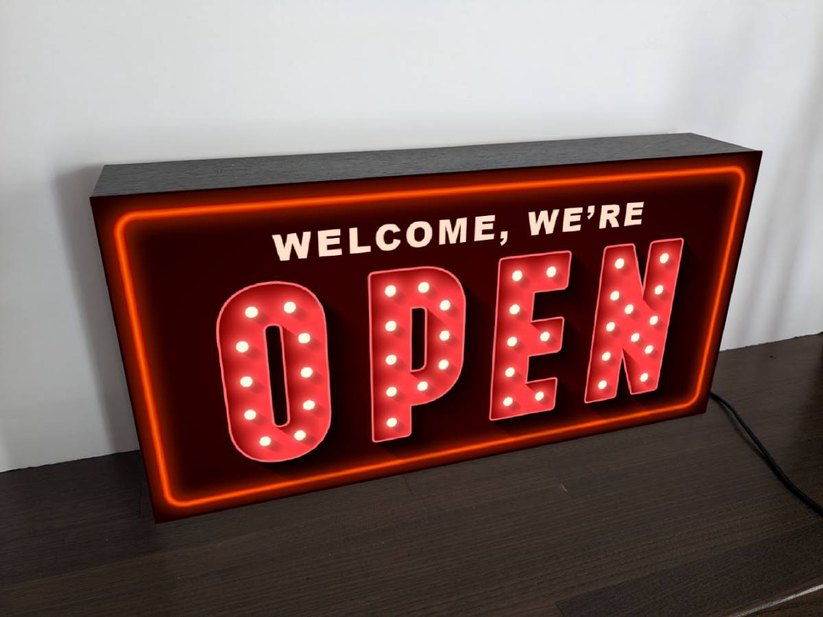 店舗、自宅、ガレージ、オフィスの窓際・カウンター・棚・テーブルやちょっとしたスペース、車内・キッチンカー・屋台・イベント・パーティーなどに 邪魔にならず丁度良い大きさの【オープン】電飾看板Lサイズです★ オーダー無料、プレゼントにも大変好評頂いております★ ◆Lサイズ◆20センチ×40センチ×奥行き7センチ ◆材質◆本体(アクリルプラスチック製)・表示面(IJバックライト発光フィルム貼り) ◆電源◆USB供給電源 〇他サイズ〇 ●SSサイズ 75mm×150mm (3D造形BOX黒本体) ●Sサイズ 10センチ×20センチ (3D造形BOX黒本体) ●Mサイズ 150mm×300mm ●LLサイズ 300mm×600mm ●3Lサイズ 400mm×800mm ●4Lサイズ 500mm×1000mm ◆オリジナルデザイン・オーダーも承っておりますので、 お気軽にお問い合わせください。 自社製造製品 店舗 自宅 キッチンカー フードトラック 屋台 パーティー イベント サイン ランプ ライト 照明 看板 インテリア雑貨 置物 雑貨 テーブル カウンター 電飾看板 電光看板