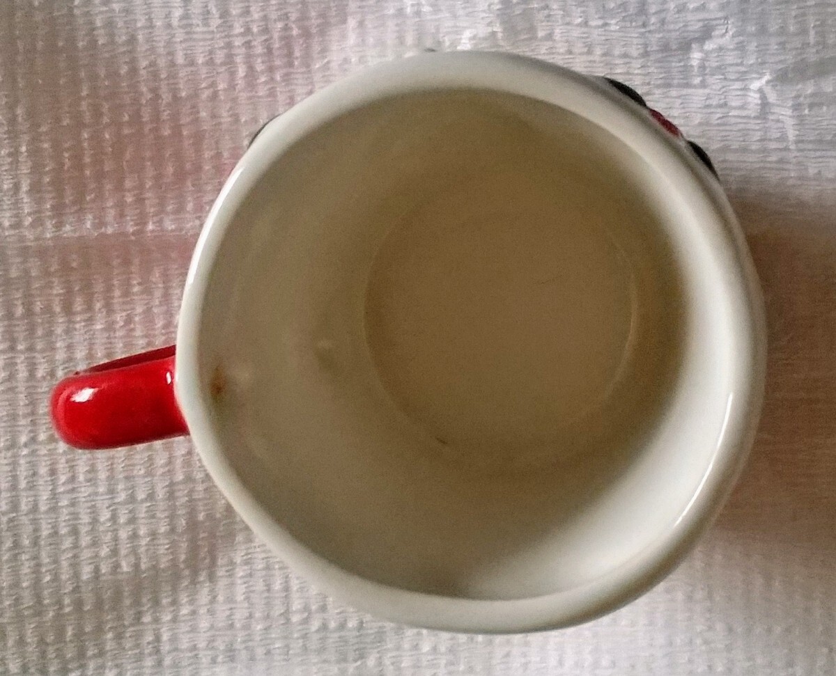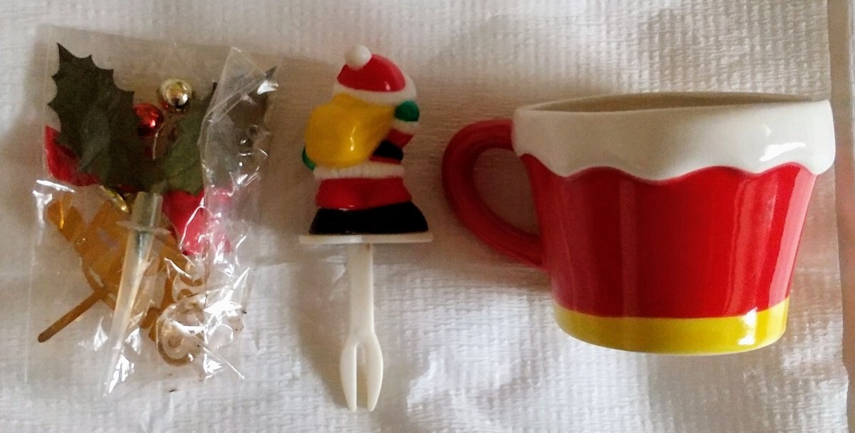 新品未使用、スイーツが入っていたマグカップで直径7cm 高さ5.5cmの陶磁器とケーキ飾り2個です。プチプチに包み、おてがる配送[ゆうパケットプラス]410円で発送します。