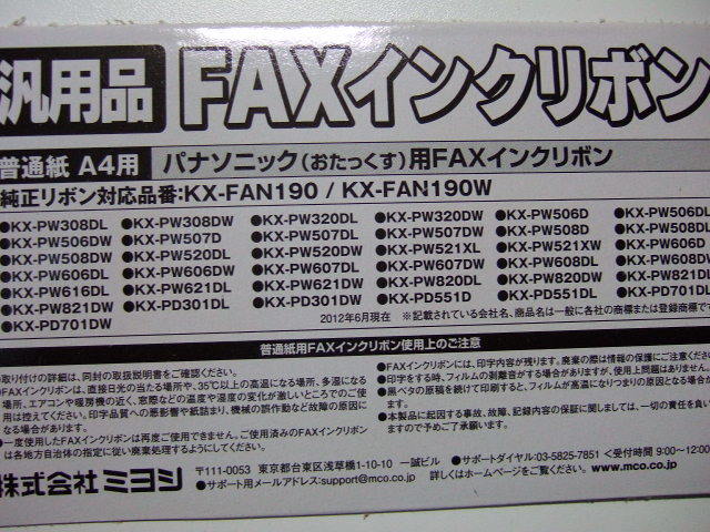 • 対応機種:(パナソニック)KX-FAN190、KX-FAN190W、KX-FAN190V が使用できるFAX機