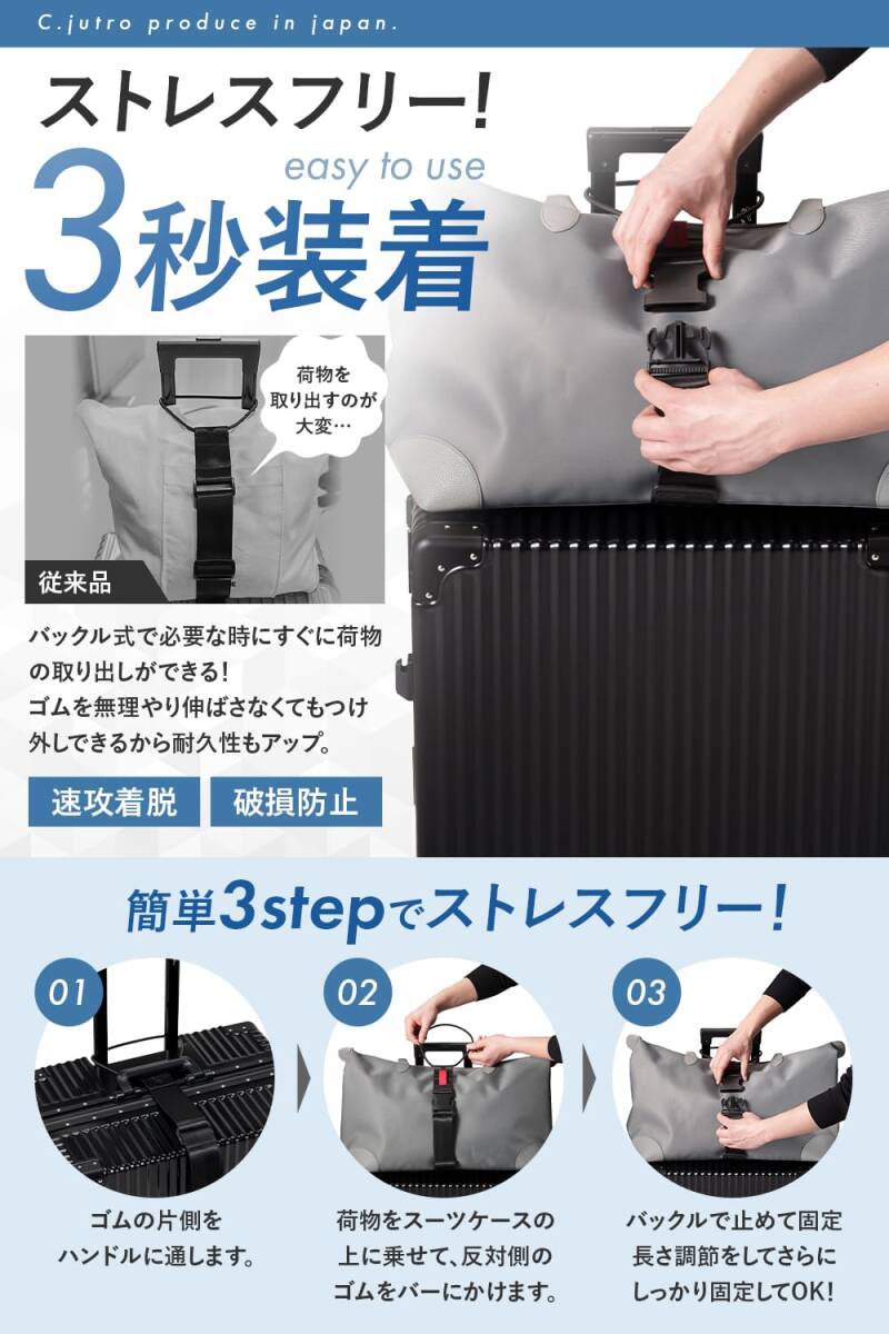 【利用シーン】旅行や出張はもちろん、子連れでの外出や空港・駅での移動時など、荷物が増えがちなあらゆるシーンで活躍します。スーツケースの取っ手部分にサッと取り付けて手荷物をまとめれば、両手が空いて行動の自由度が大きくアップ。お土産が増えたときや、抱っこが必要な場面でも重宝するアイテムです。