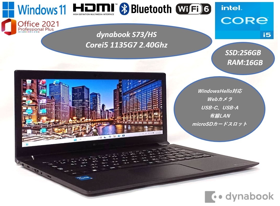 超美品 高性能 2021年製 軽量 薄型 13型 dynabook S73/HS★Win11 Pro+Office2021★Webカメラ USB-C HDMI | |||