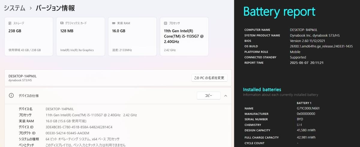 | ⭐商品特長⭐ ✅2021年3月発表、第11世代のインテルCorei5プロセッサーを搭載。長時間駆動を実現、モビリティをあらゆる次元で追求。プレミアムモバイルノート ✅M.2タイプSSD256GB&メモリ16GB内蔵、サクサクな動き、複数なアプリを起動しても遅くならない ✅第三者機関による各種耐久テストで、その優れた堅牢性を徹底検証しています。たとえば底面や天面をはじめ26方向からの落下テストなどMIL規格に準拠したテストをクリアしています ✅高品位な質感と同時に、滑りにくく、持ちやすい薄型のコンパクトなボディに ✅長時間のモバイルワークをサポート バッテリー駆動約13.0時間 ✅無線LAN規格 Wi-Fi 6に対応、Webカメラ、USBポート、USB-Cポート、HDMIポート、microSDカードスロット搭載。持ち運びやすく、外でのご利用や出張の時に非常に便利 ⭐商品特徴⭐ ✅Windows 11 Pro 64bit搭載 ✅正規マイクロソフトオフィス:Microsoft Office 2021 Pro Plusインストール&ライセンス認証済【プロダクトキー付属】 ✅「Windows defender」搭載 ⭐プレミアム仕上⭐ ✅(正規)OSやオフィスをセットアップ、インストールがすべて完了 ✅高速なSSD(ソリット・ステート・ドライブ)搭載 ✅AOMEI OneKey Recoveryアプリをインストール済、いつでも利用可能 ✅あったら便利なアプリを厳選して、インストール済です。届いたらすぐ使えます ⭐商品スペック⭐ ⭕メーカー: dynabook ⭕型番:dynabook S73/HS(2021年3月発売モデル) ⭕OS:Win11 Pro 64bit ⭕オフィス:Microsoft Office 2021 Pro Plus【プロダクトキー付属】 ⭕CPU:Core i5 1135G7 2.40GHz ⭕RAM:16GB(PC4-25600(DDR4-3200)対応 SDRAM、デュアルチャネル対応) ⭕SSD:256GB ⭕Webカメラ:内蔵(有効画素数 約92万画素(デュアルマイク付) ⭕ディスプレイ:13.3型 FHD広視野角 TFTカラー LED液晶(ノングレア)(省電力LEDバックライト 1,920×1,080ドット ⭕グラフィック:インテル Iris Xe グラフィックス ⭕通信機能:Wi-Fi 6(IEEE802.11ax)(2.4Gbps)対応+IEEE802.11ac/a/b/g/n準拠(WPA/WPA2/WPA3対応、WEP対応、AES対応、TKIP対応) + Bluetooth 5.1 ⭕インターフェース:SDカードスロット、HDMI出力端子×1、LAN(RJ45)×1、USB3.1(Gen1)×2、USB3.1(Gen1)Type-Cコネクタ×1、マイク入力/ヘッドホン出力端子×1 ⭕外形寸法:約316.0(幅)×227.0(奥行)×19.9(高さ)mm ⭕質量:約1.189kg ⭕付属品:純正ACアダプター&ケーブル ⭐バッテリの状態⭐ <Battery Report>で検査しました バッテリーの容量値:41,580mWh バッテリーの残量値:42,981mWh 残量:103% (42,981/41,580*100%) ⭐商品状態⭐ ※評価は「主観」になります。程度の捉え方には個人差が有ります。ご理解の程、よろしくお願いいたします※ ⭕天板:使用に伴う小傷がございますが、状態綺麗 ⭕キーボード:テカリ、傷、剥げ等なく、状態が非常に綺麗 ⭕パームレスト:状態綺麗 ⭕液晶:白ムラ、傷等なく、発色良好 ⭕その他:他の目立った不具合はありません ⭕総合:使用に伴う小傷等がありますが、全体的に状態がかなり良く、超美品です | |||