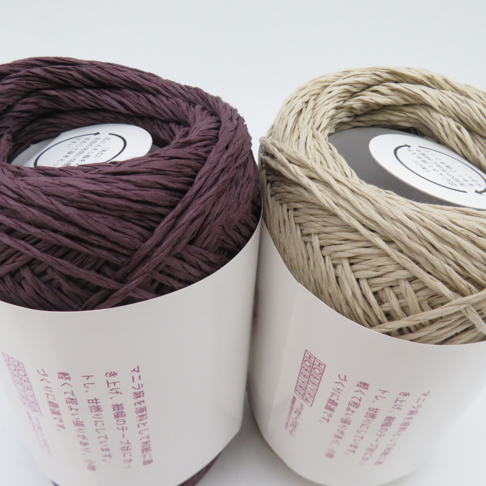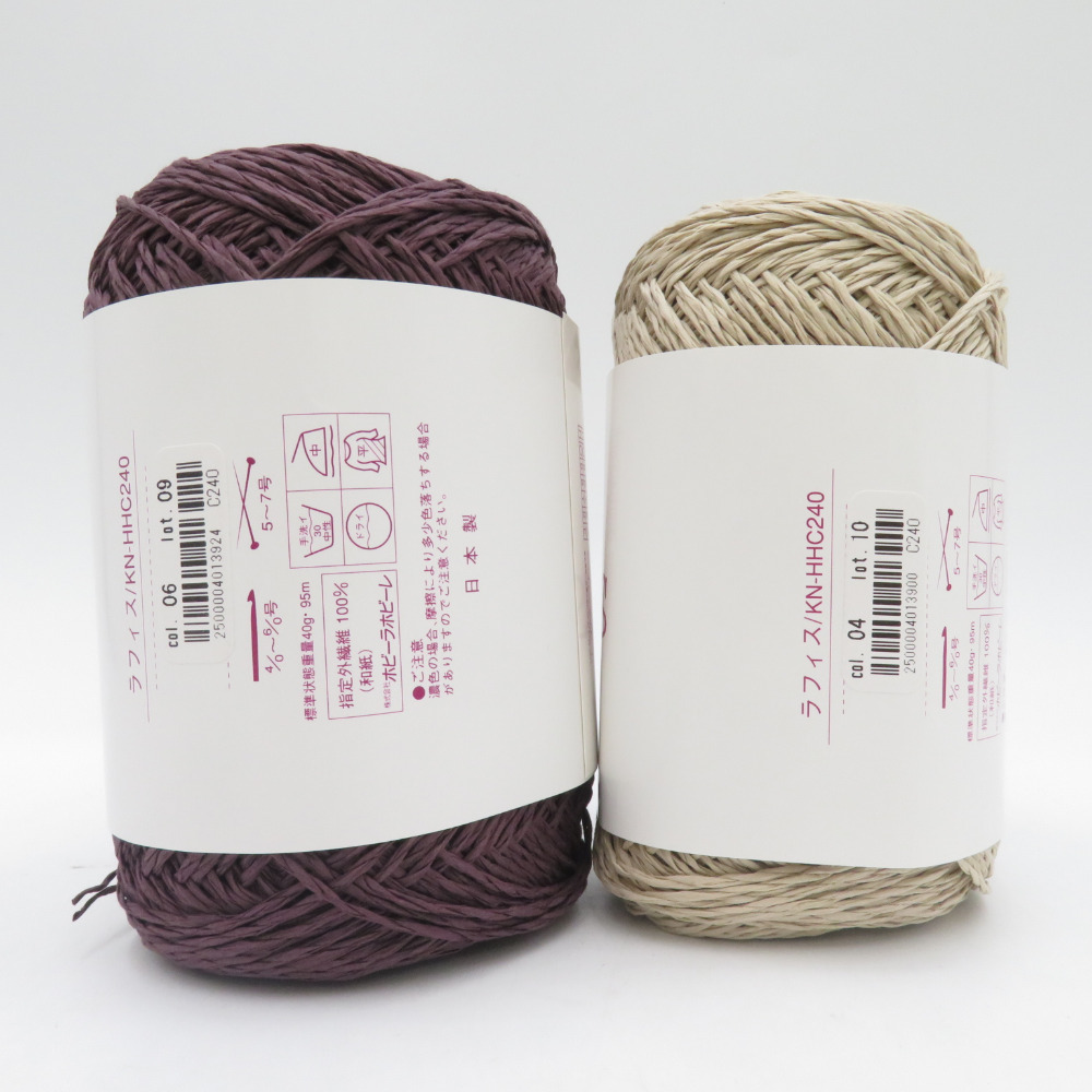 | 商品説明 | マニラ麻を原料として和紙に漉し上げ、細幅のテープ状にカットし撚りをかけた糸を2本合わせて甘撚りにしています。 軽くて程よい張りがあり、カギ針編みの小物づくりに最適です。 品名:ラフィス KN-HHC240 COL:4番色×2 6番色×3 仕立て:40g 約95m 使用針:棒針 5~7号、かぎ針 4/0~6/0号 | ||