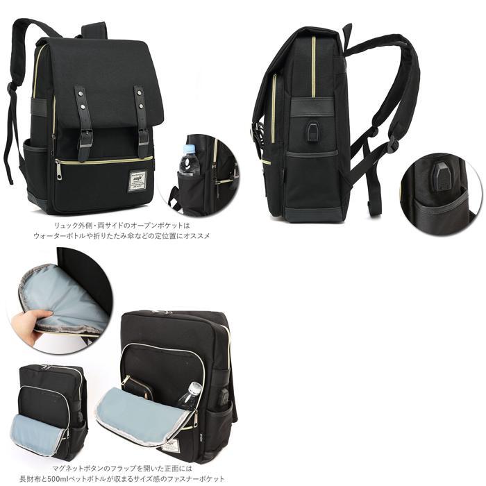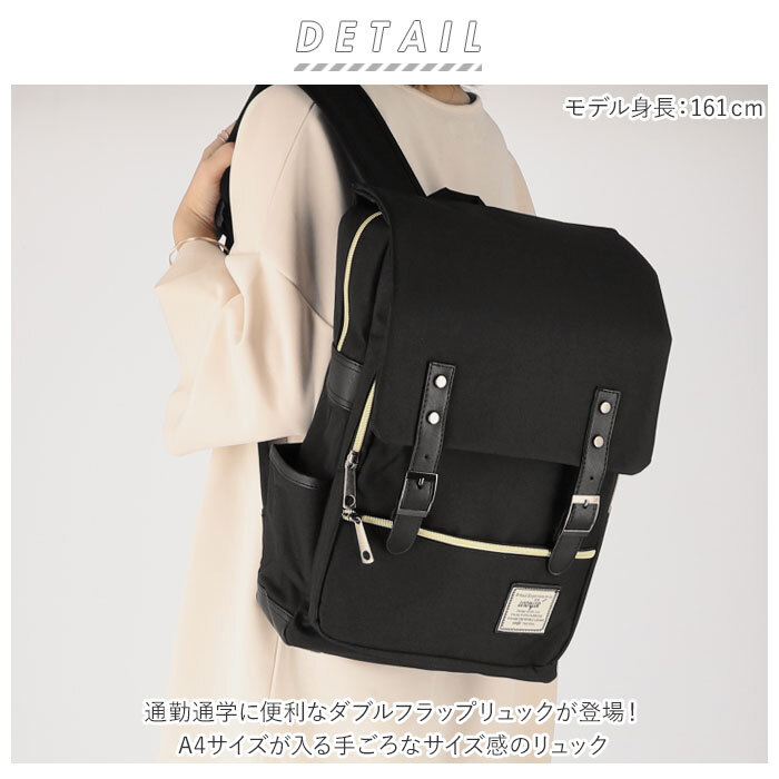商品説明 | ・通勤通学に便利なダブルフラップリュックが登場! ・A4サイズが入る手ごろなサイズ感のリュック。ノートPCやタブレット類(12インチまで)も入れられるクッション付きオープンポケット×1と小物の収納に便利なファスナーポケット付き。 ・マグネットボタンのフラップを開いた正面には長財布と500mlペットボトルが収まるサイズ感のファスナーポケット。 ・さらにフロント下部にスマホやキーケースなどサッと取り出したい小物の収納に役立つファスナーポケットも。 ・リュック外側・両サイドのオープンポケットは、ウォーターボトルや折りたたみ傘などの定位置にオススメ。 ・モバイルバッテリーからの給電に便利なUSBポートもありとっても機能的。 |